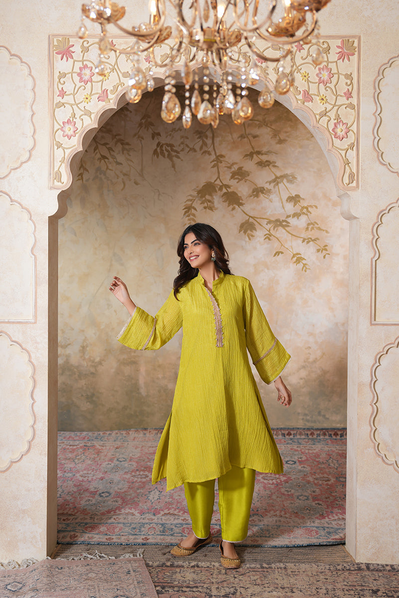 Lime Crushed Tissue Silk A-line Kurta With Lime Chanderi Narrow Pants With Gota And Pearl Work