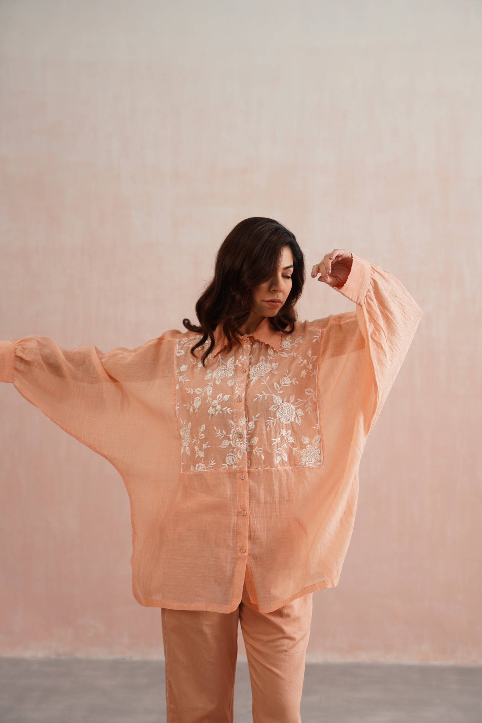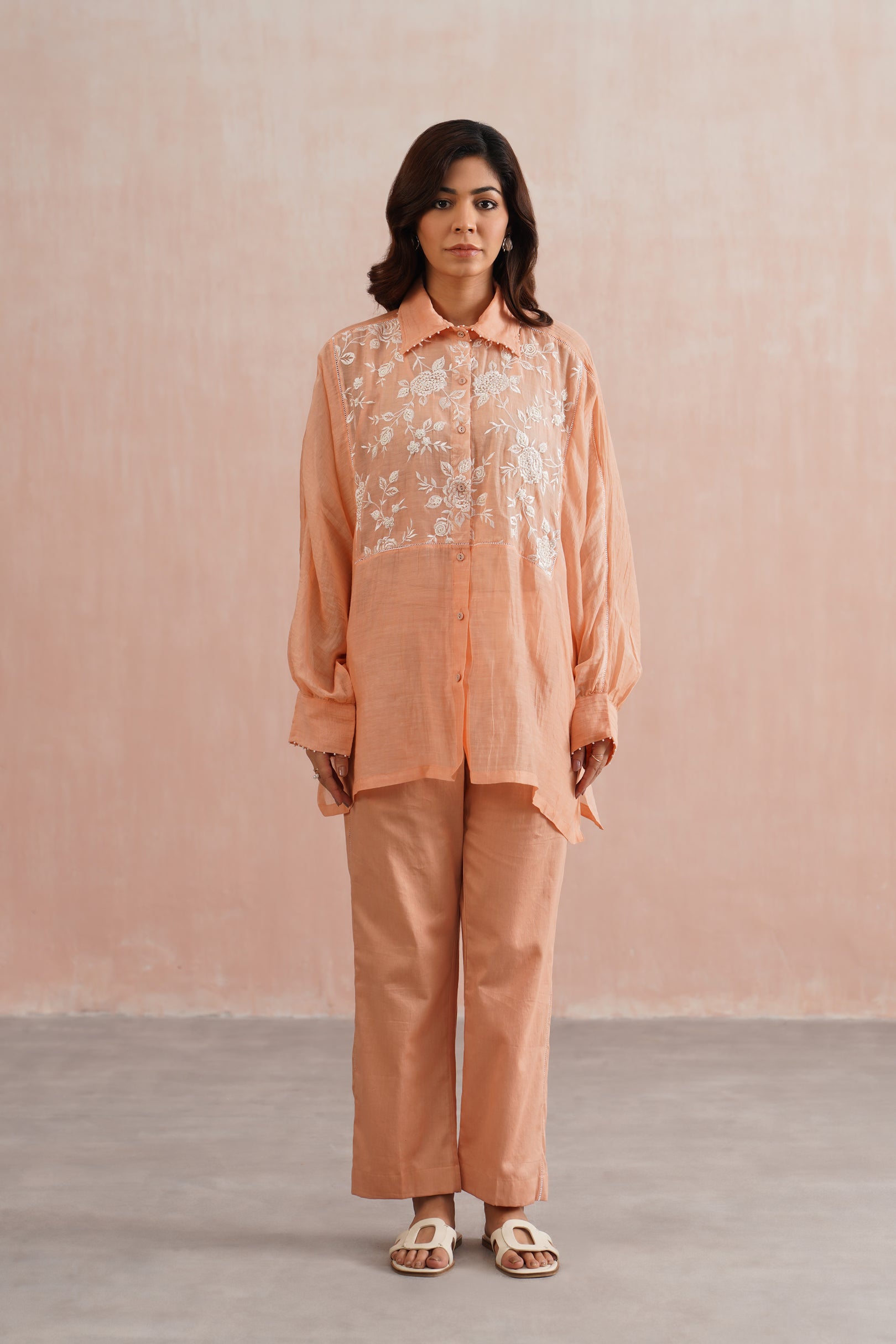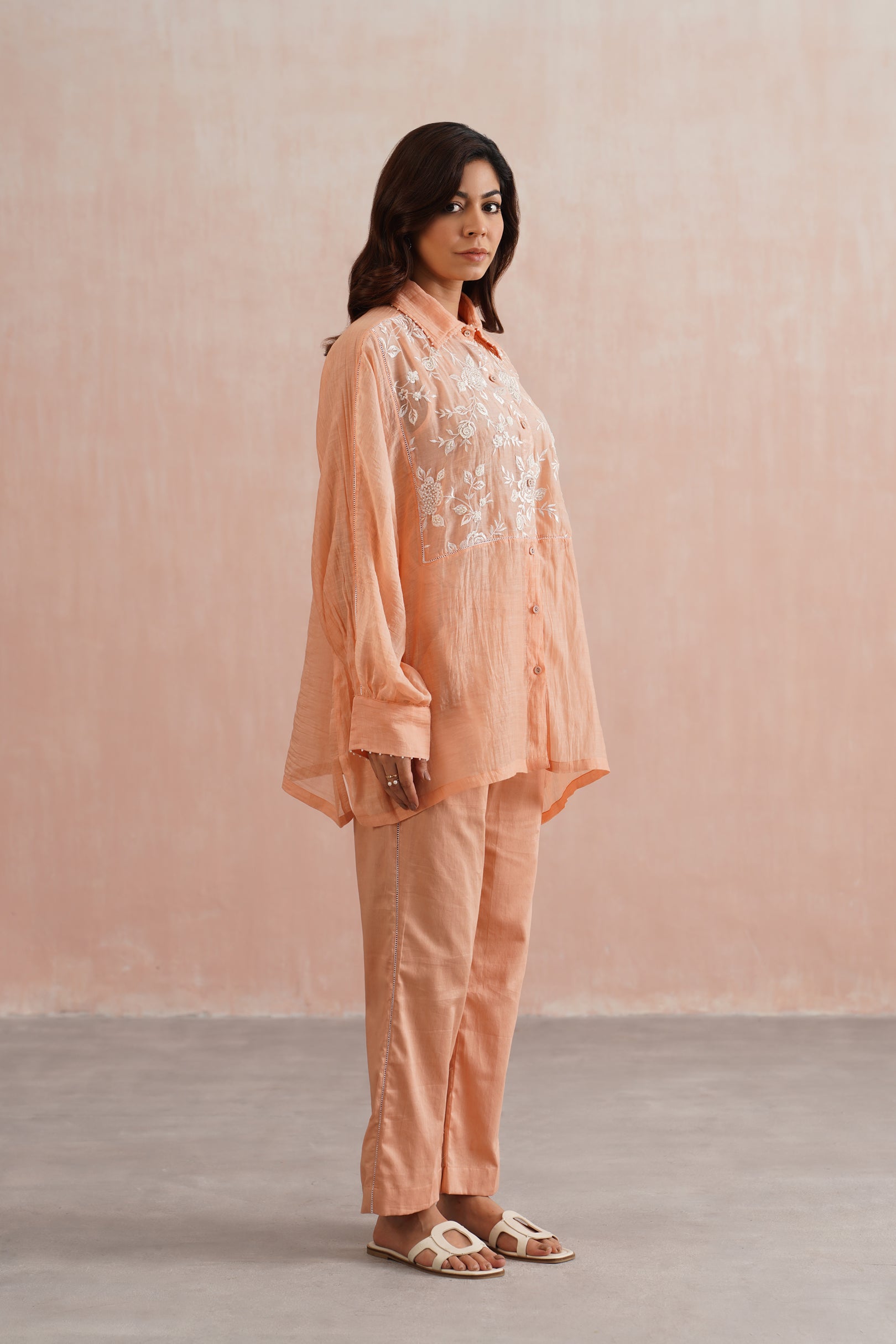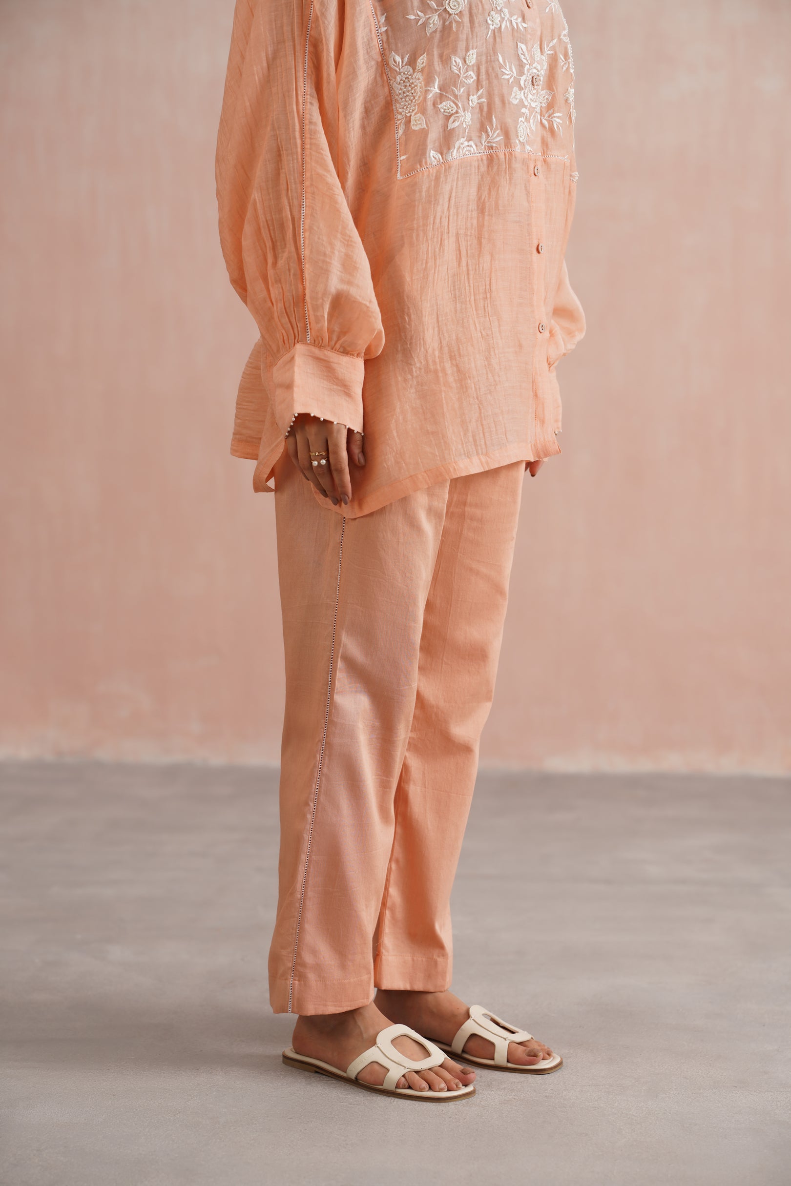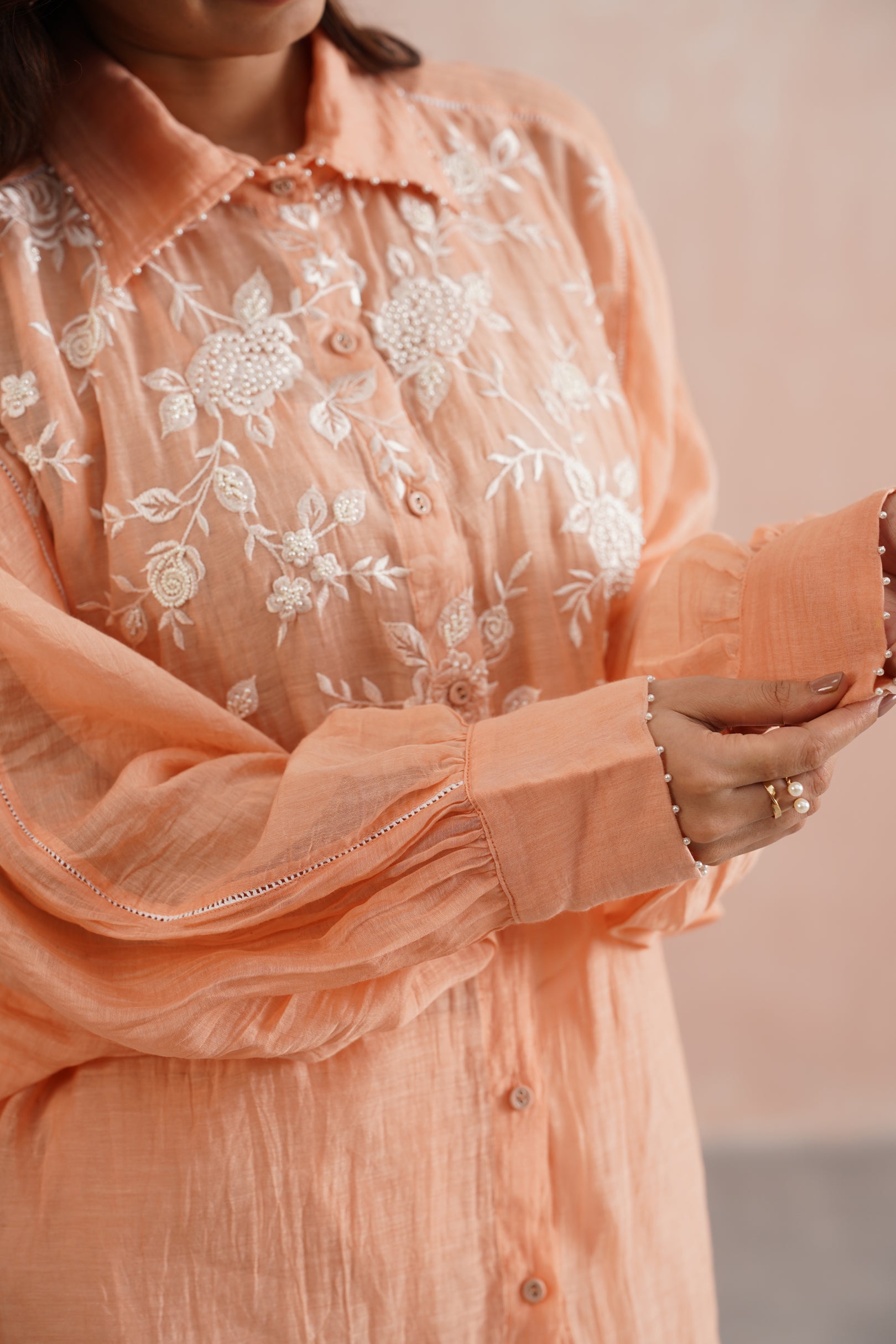 Mul chanderi pearl embroidered kimono shirt paired with cotton pants