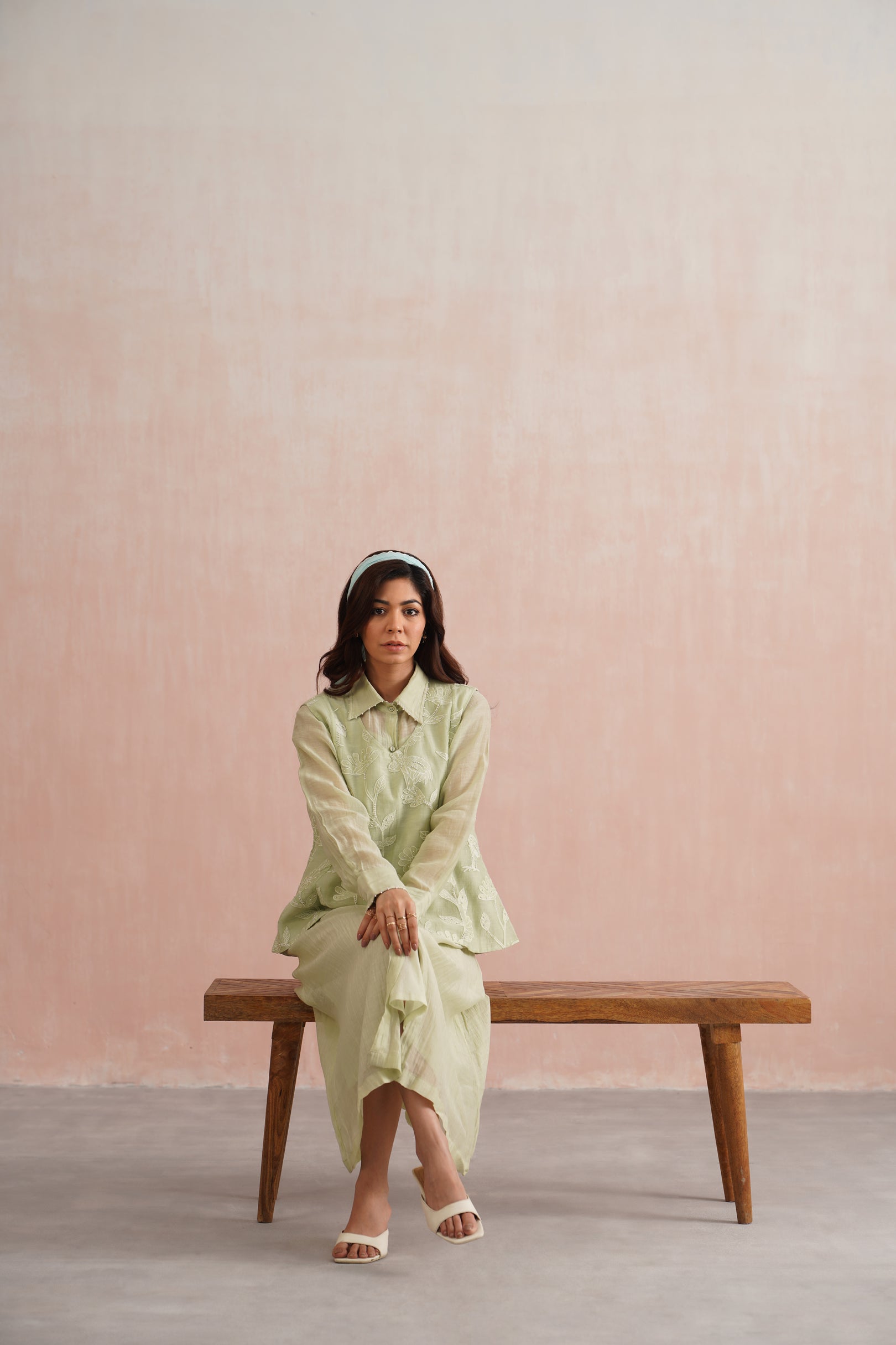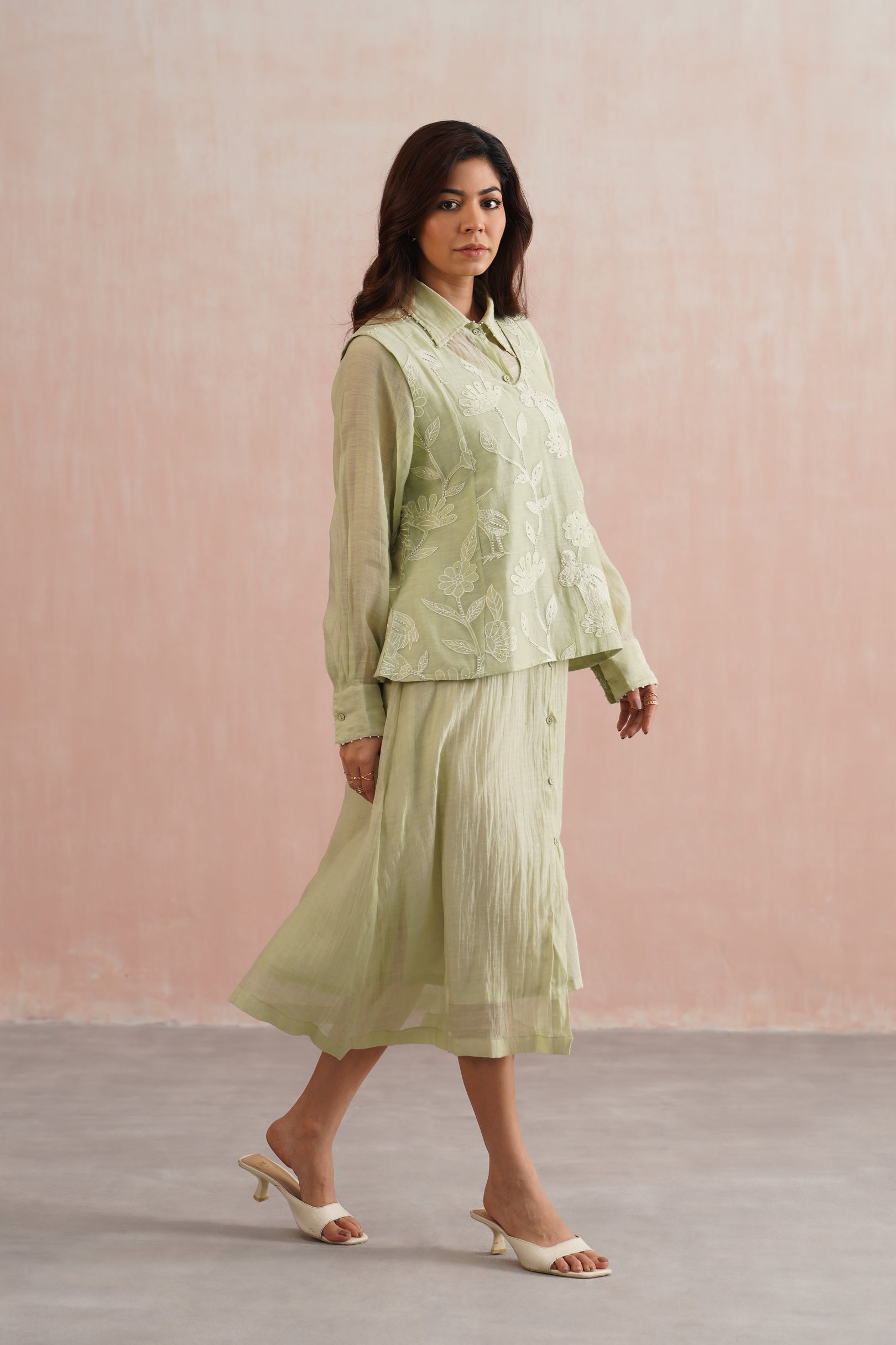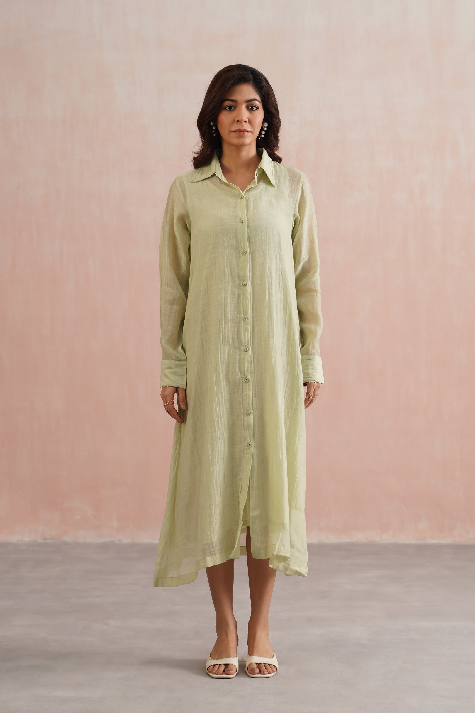 Mul chanderi button down dress paired with applique work top and pearl embroidery