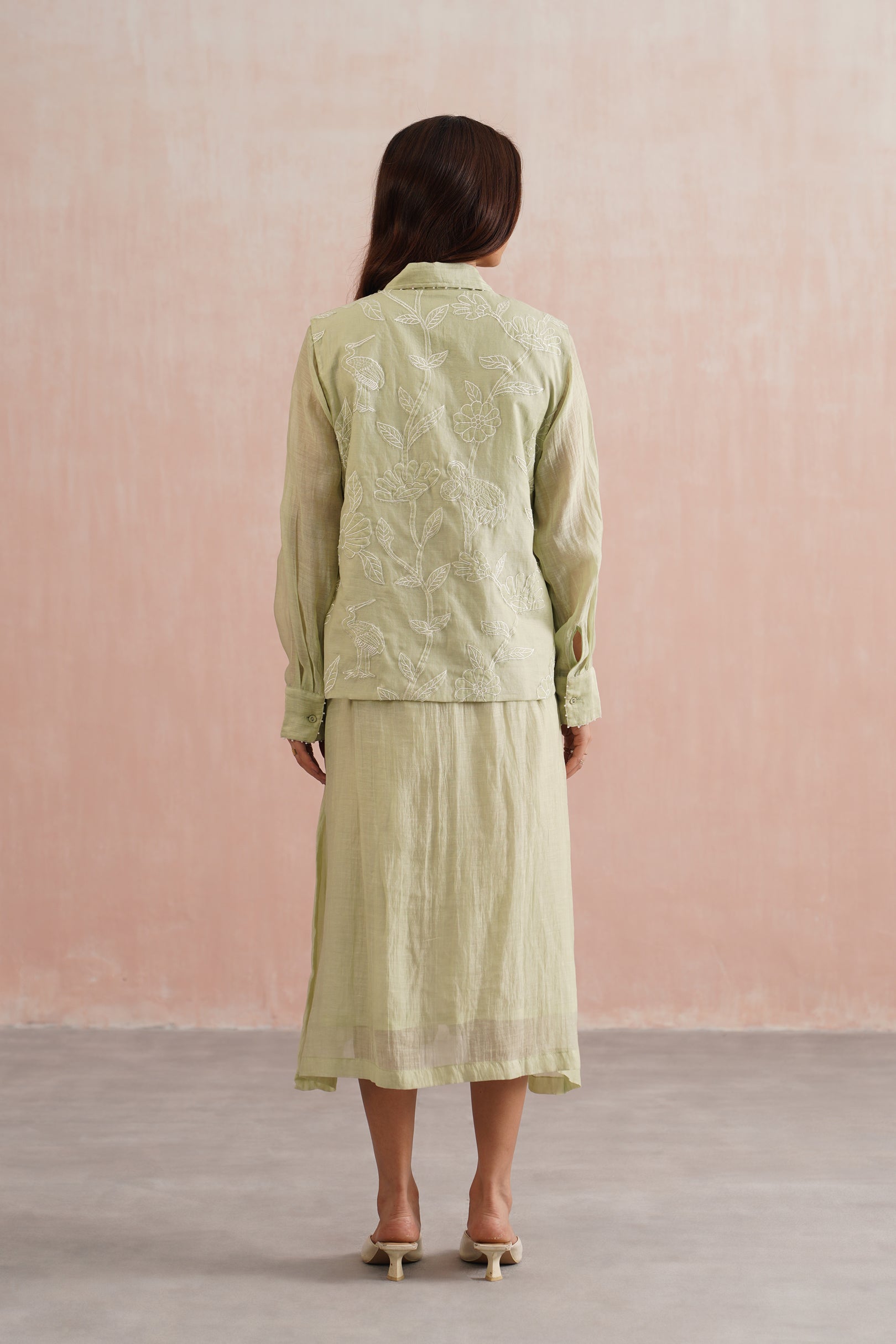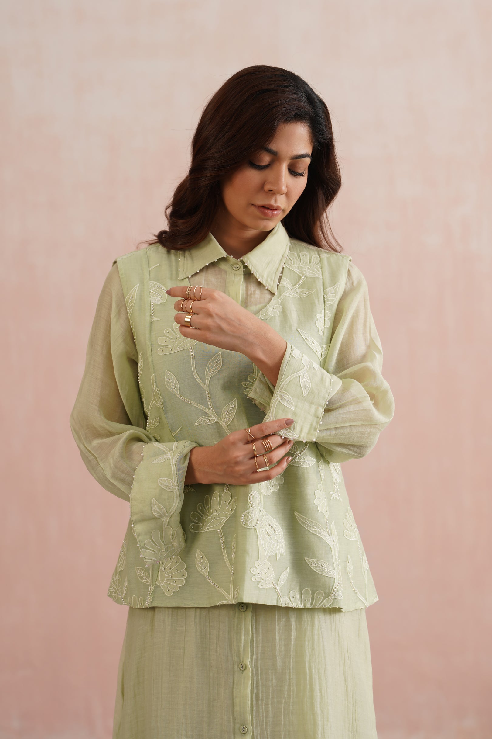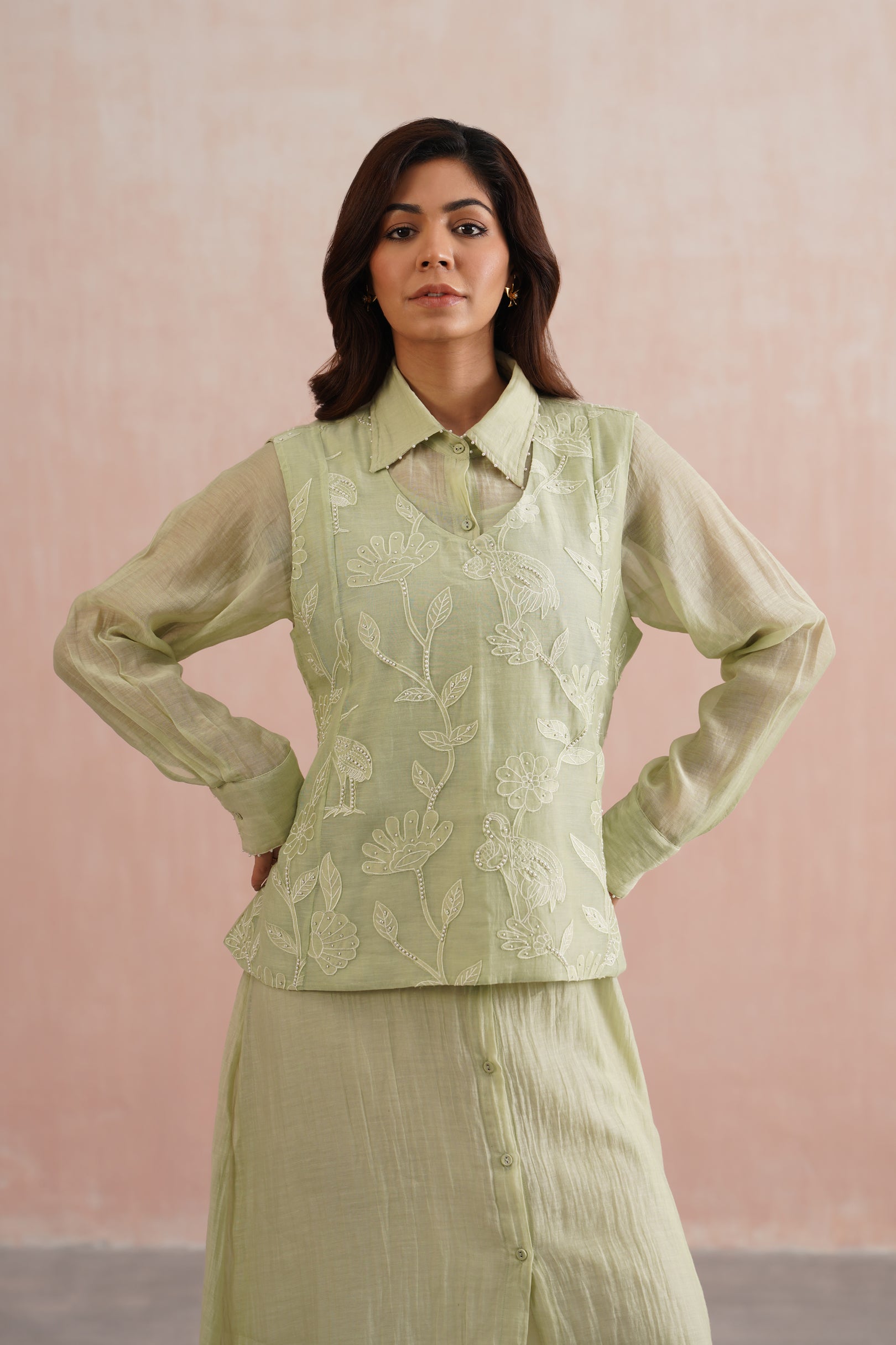 Mul chanderi button down dress paired with applique work top and pearl embroidery