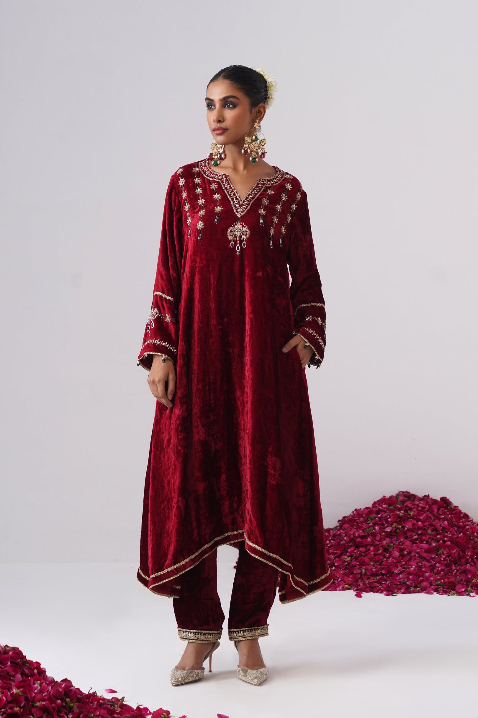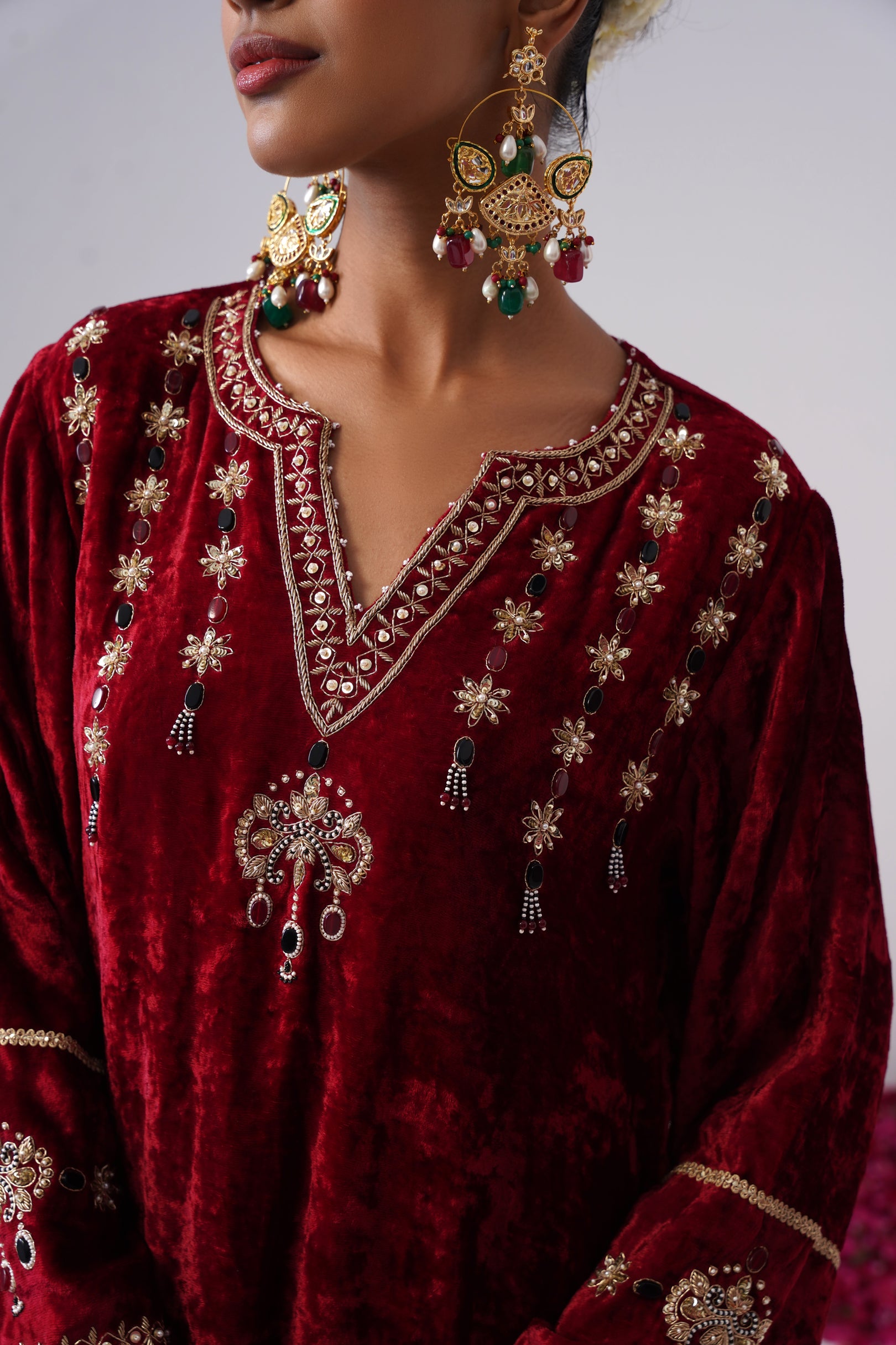 This all-red, tone-on-tone Gulnaar velvet kurta set is crafted in a graceful A-line silhouette with short side slits for effortless movement. It features a round neckline with a slit, highlighted with delicate handcrafted pearl detailing, designed with full sleeves and functional pockets. The kurta is lined with pure cotton fabric and features intricate zardozi embroidery on the yoke and sleeves, highlighted with black and red tonal semi-precious jewel stones. Gold lace detailing along the ghera adds a subtle festive finish, while the plush velvet lends richness to the overall look.