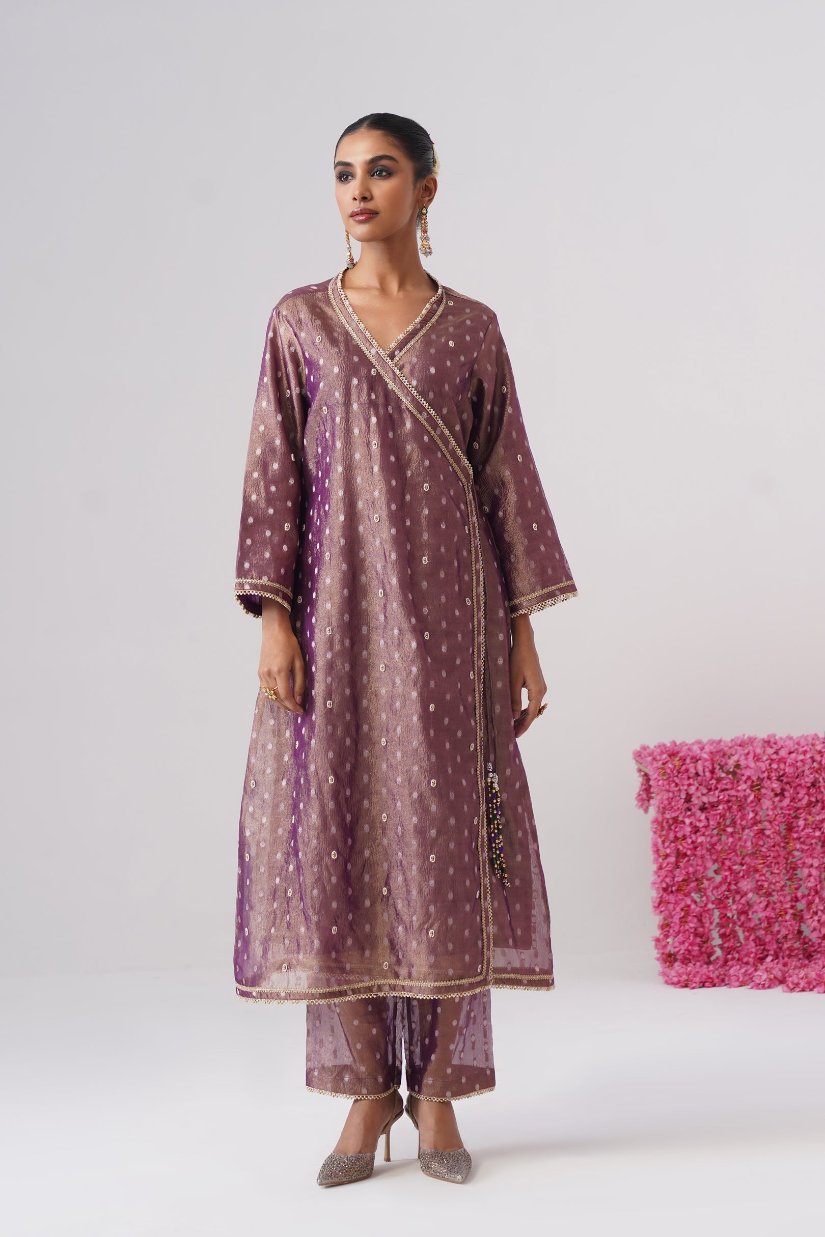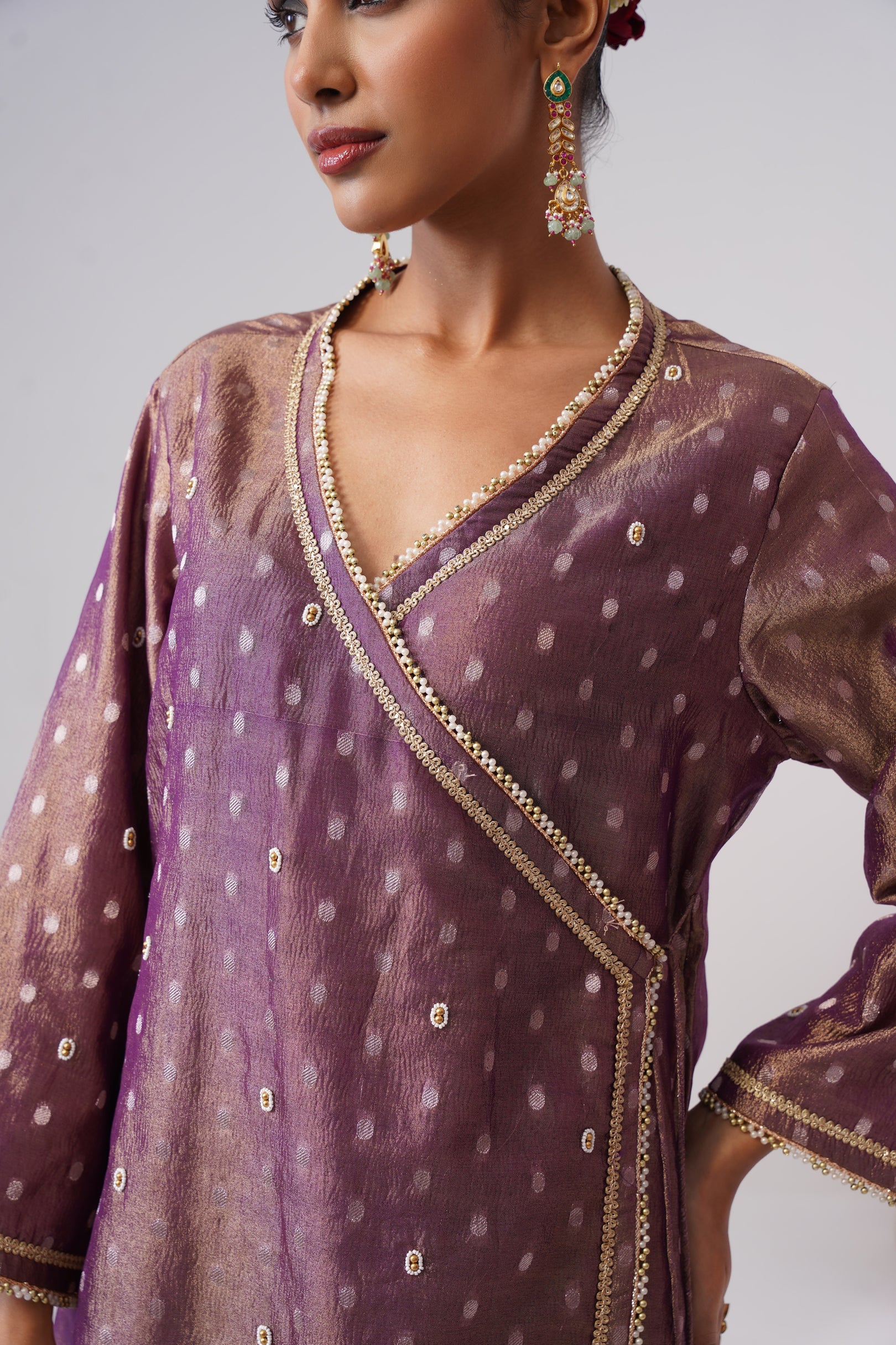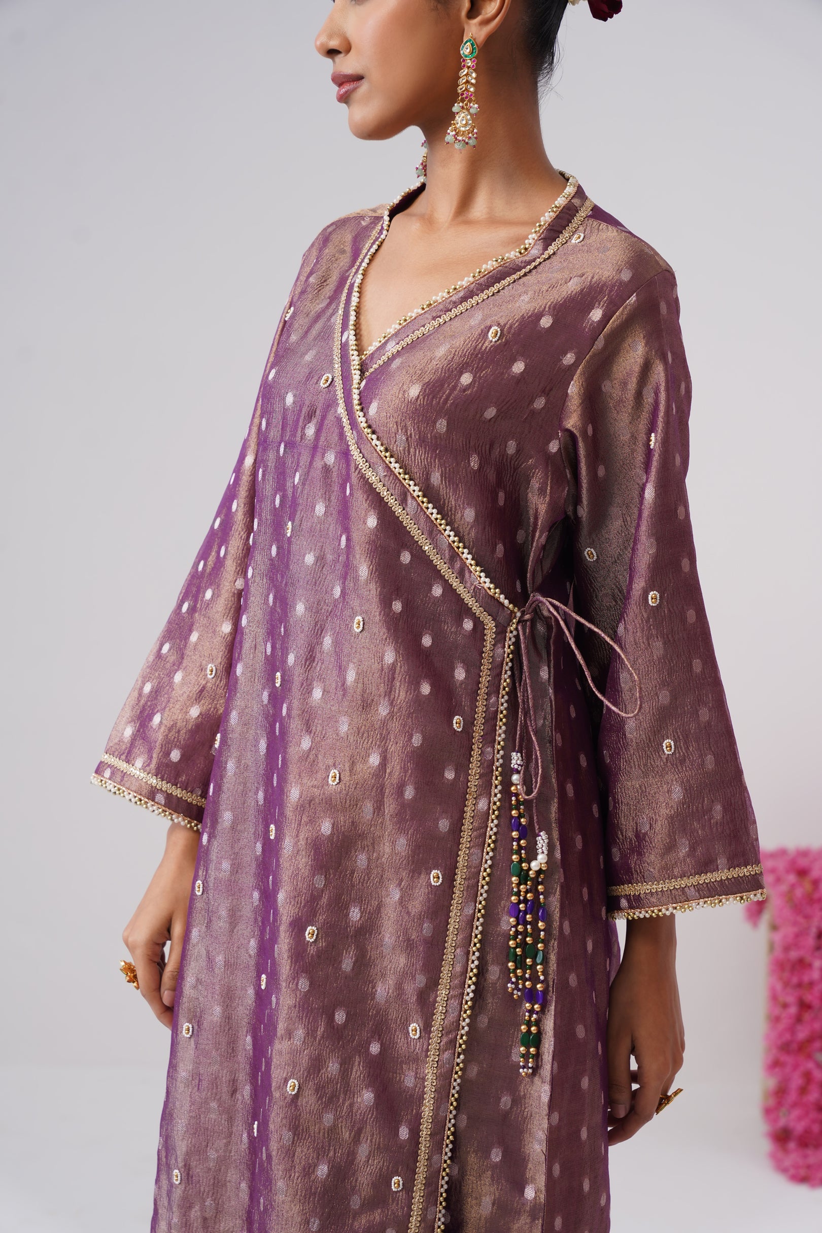 This purple Angrakha kurta is crafted in crushed tissue silk with delicate woven zari polkas, offering a soft festive sheen. Designed in a classic wrap silhouette, it features a button closure on one side and a traditional dori tie-up on the other, finished with semi-precious stone tassels. The kurta is richly embellished with pearl embroidery, golden beadwork, and lace detailing throughout, and is lined with pure cotton for all-day comfort.