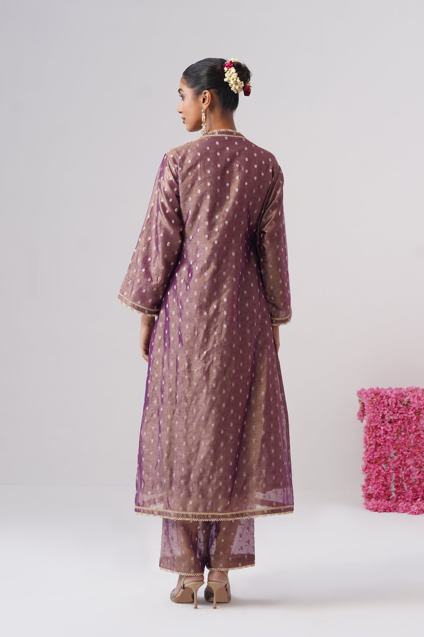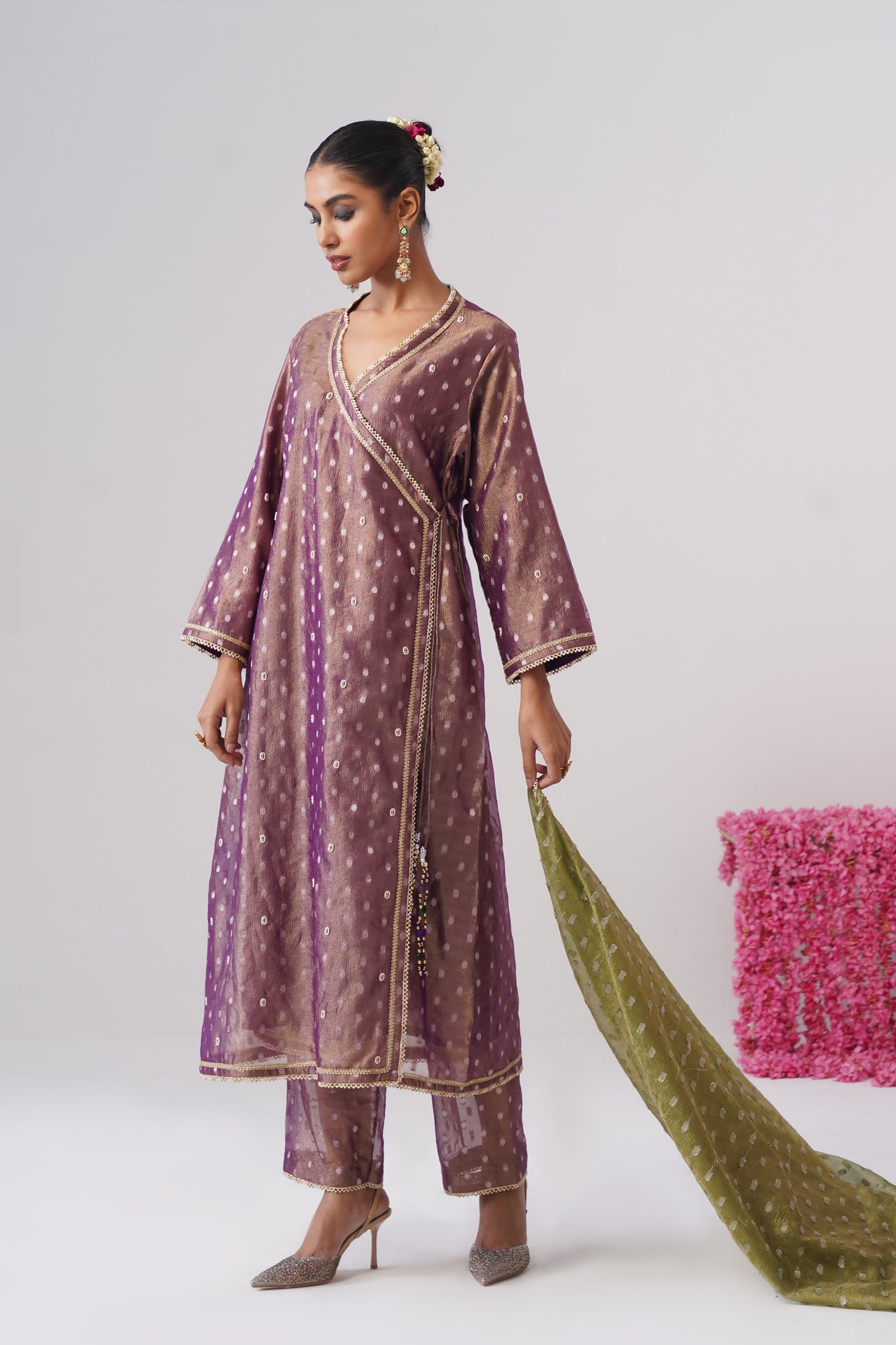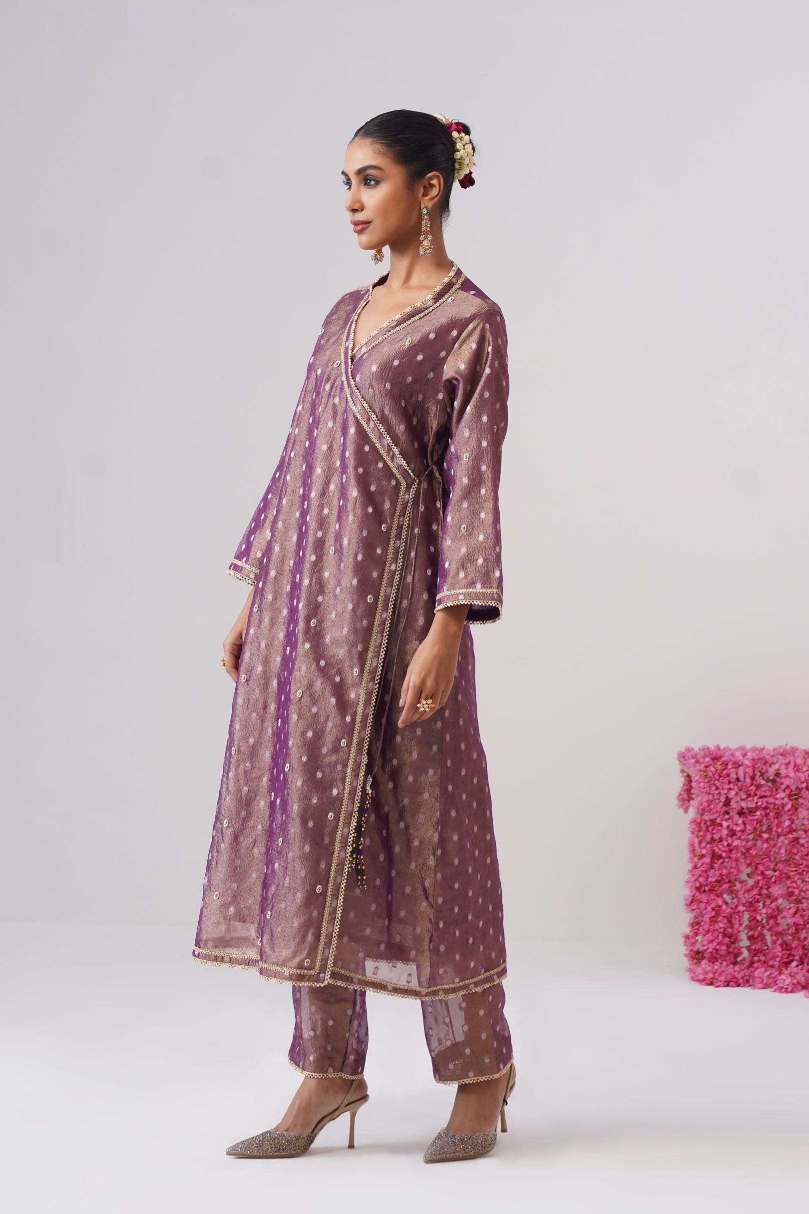 This purple Angrakha kurta is crafted in crushed tissue silk with delicate woven zari polkas, offering a soft festive sheen. Designed in a classic wrap silhouette, it features a button closure on one side and a traditional dori tie-up on the other, finished with semi-precious stone tassels. The kurta is richly embellished with pearl embroidery, golden beadwork, and lace detailing throughout, and is lined with pure cotton for all-day comfort.