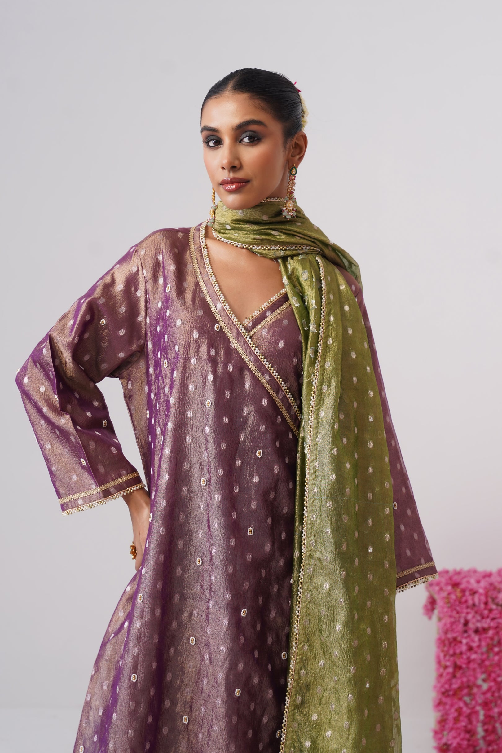 Purple pearl embroidered crushed tissue silk angrakha paired with cotton silk pants and embroidered green crushed tissue silk dupatta