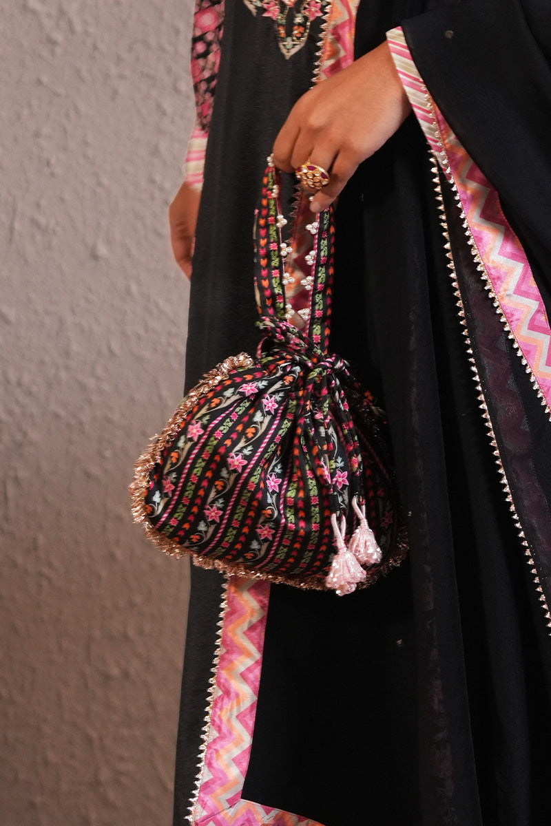Black Crepe Silk Printed Potli With Pearl Work Detailing And Hand Embroidered Latkans