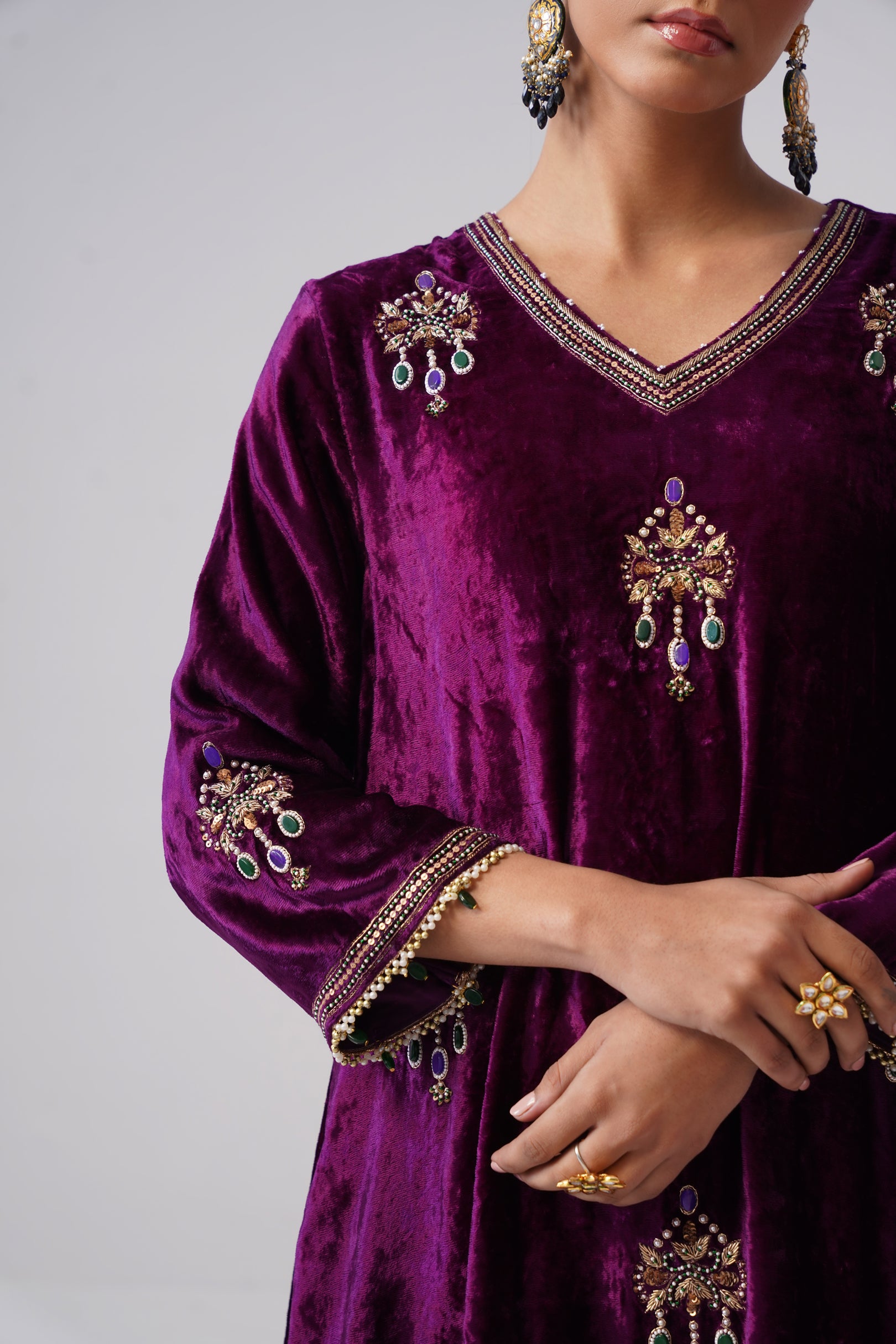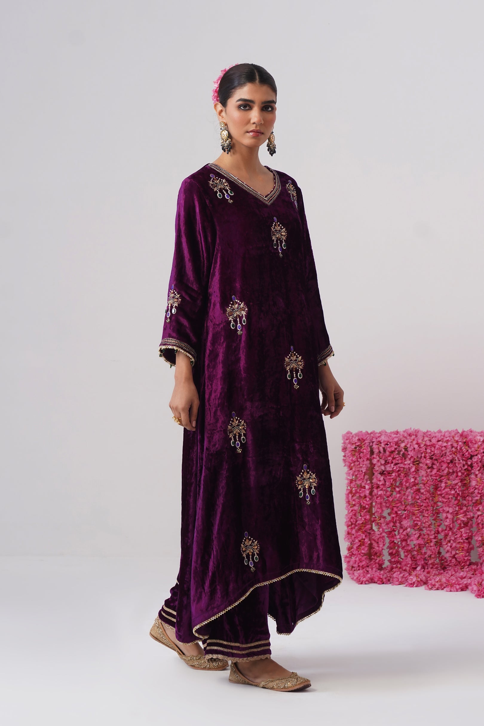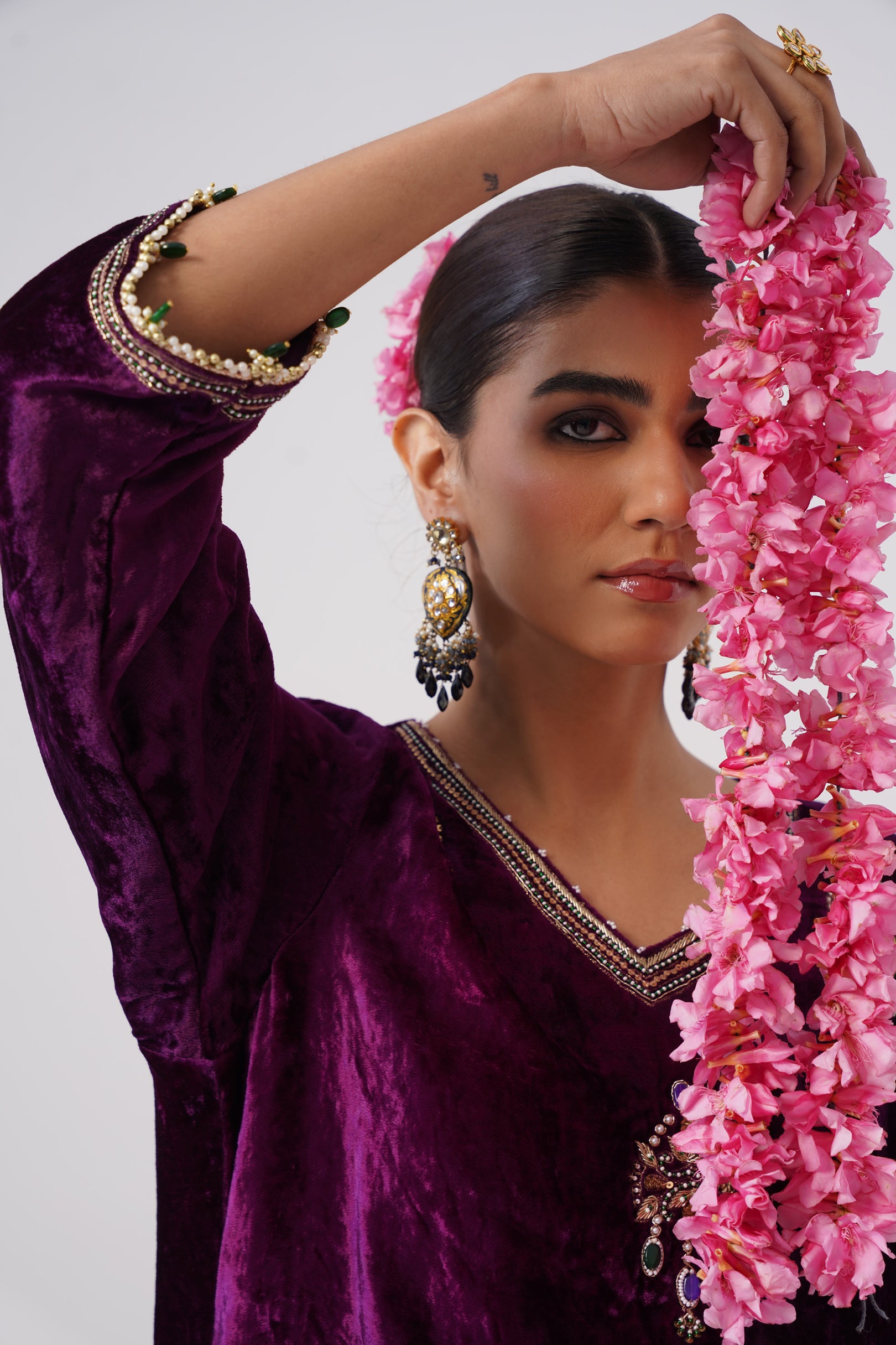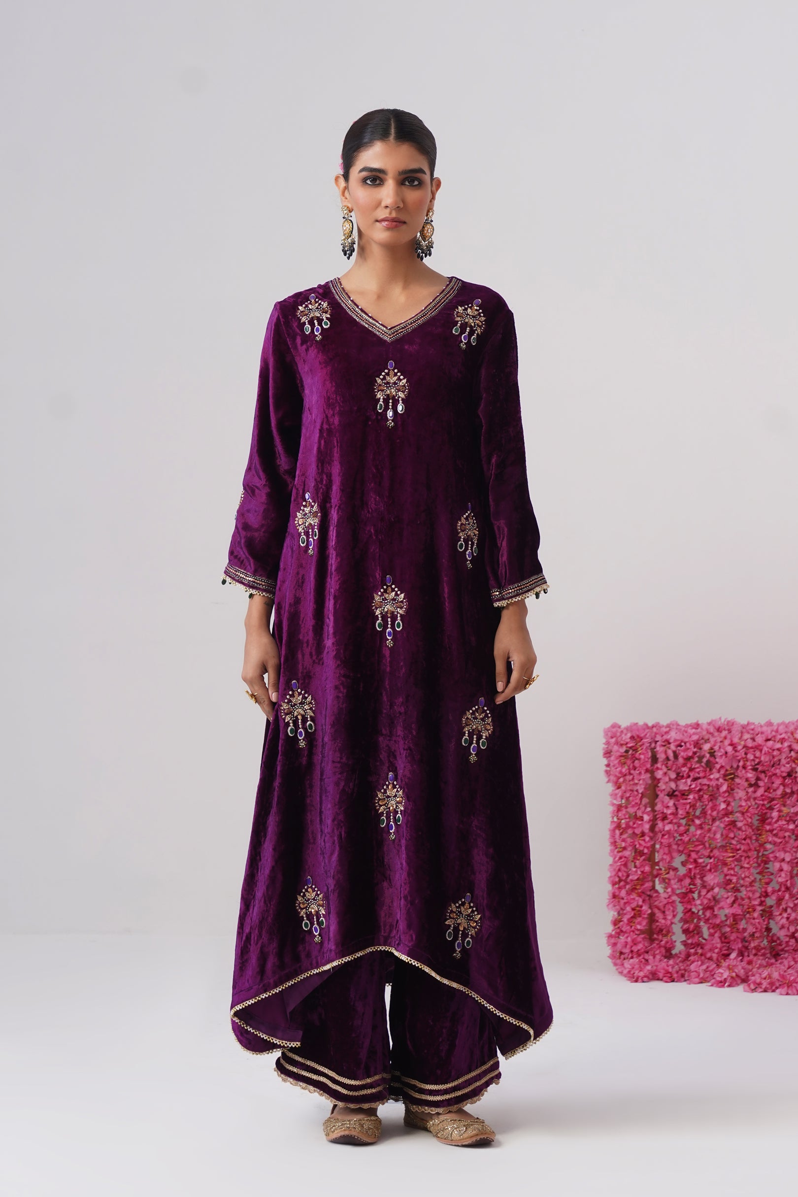 The Khwaab Set is crafted in rich deep purple velvet, featuring an A-line kurta with pockets and subtle side slits for ease of movement, fully lined with pure cotton for comfort. The V-neckline is adorned with intricate hand zardozi embroidery and pearl detailing, while delicate boota embroidery flows across the kurta and quarter sleeves. Pearl and gold work along the sleeves are finished with emerald green jewel hangings, echoing the semi-precious purple and emerald stones used throughout. The kurta is paired with tonal velvet palazzo pants, detailed with scalloped and gold laces that complement the embroidery and pearl work on the ghera of the kurta.