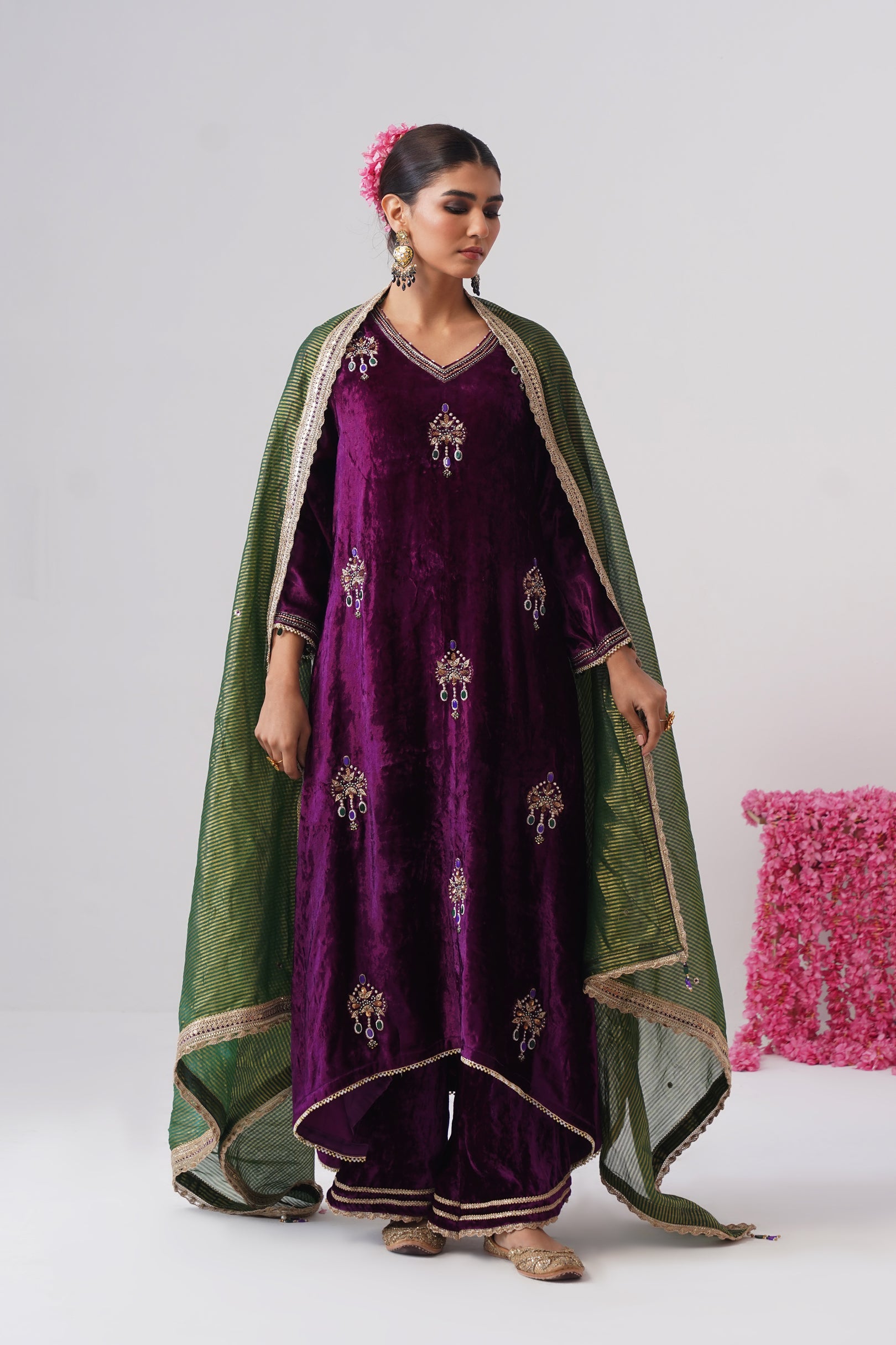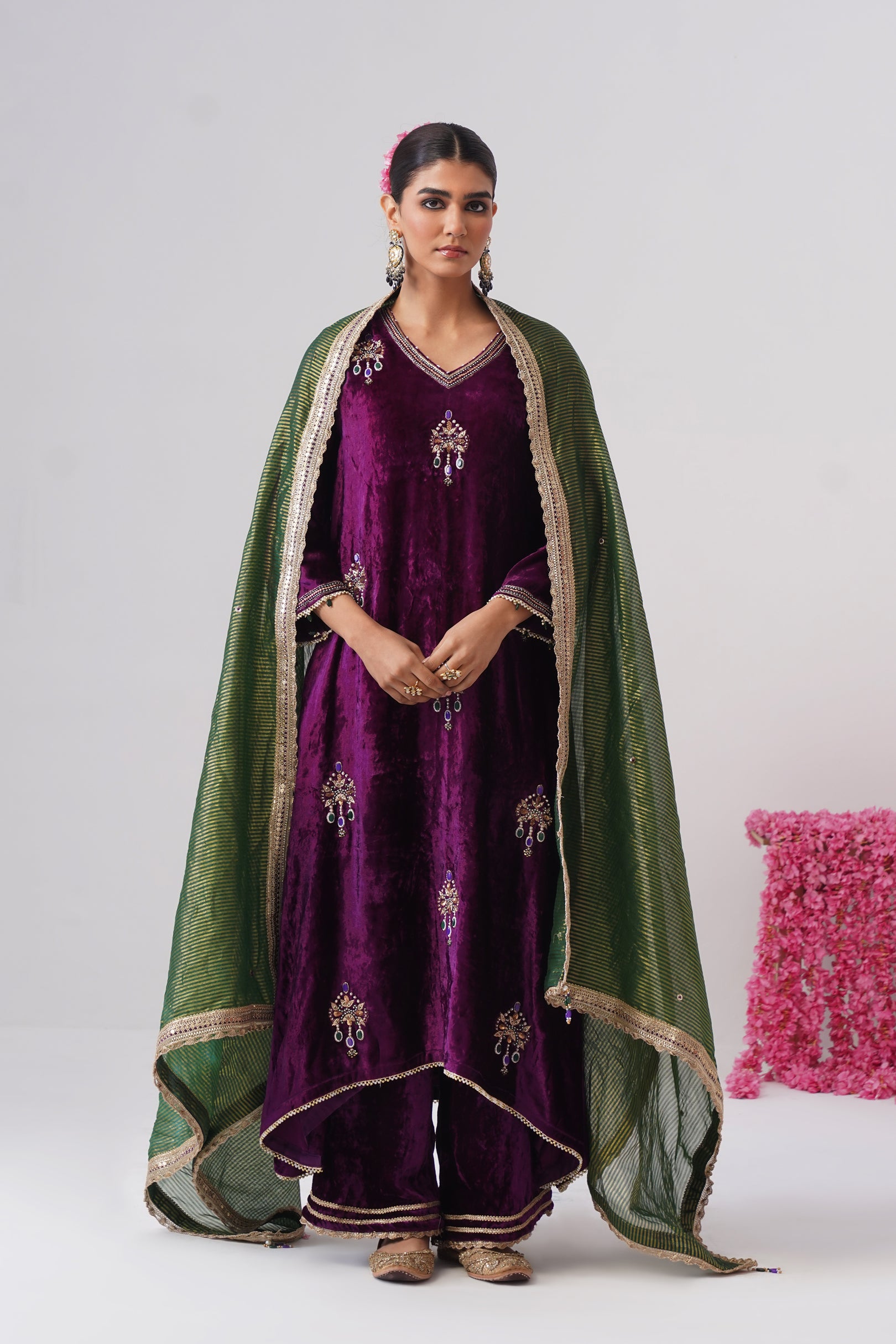 Deep Purple zardozi embroidered velvet kurta paired with velvet palazzo and embroidered tissue chanderi stripe dupatta