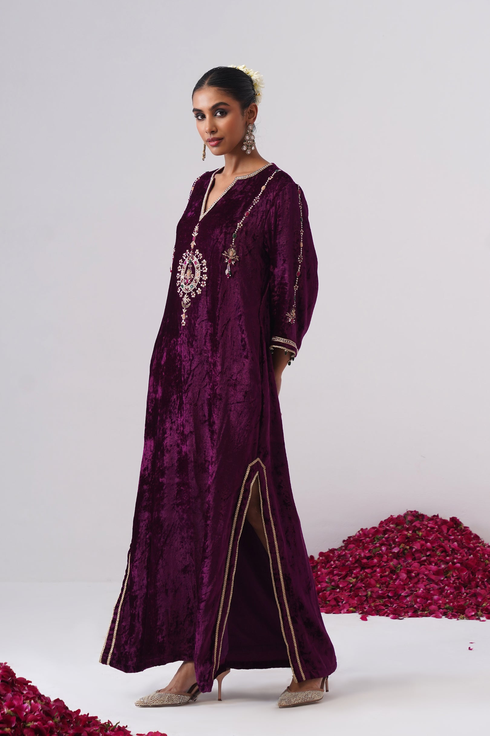 Deep Purple velvet kaftan with zardozi and jewel stones hand embroidery