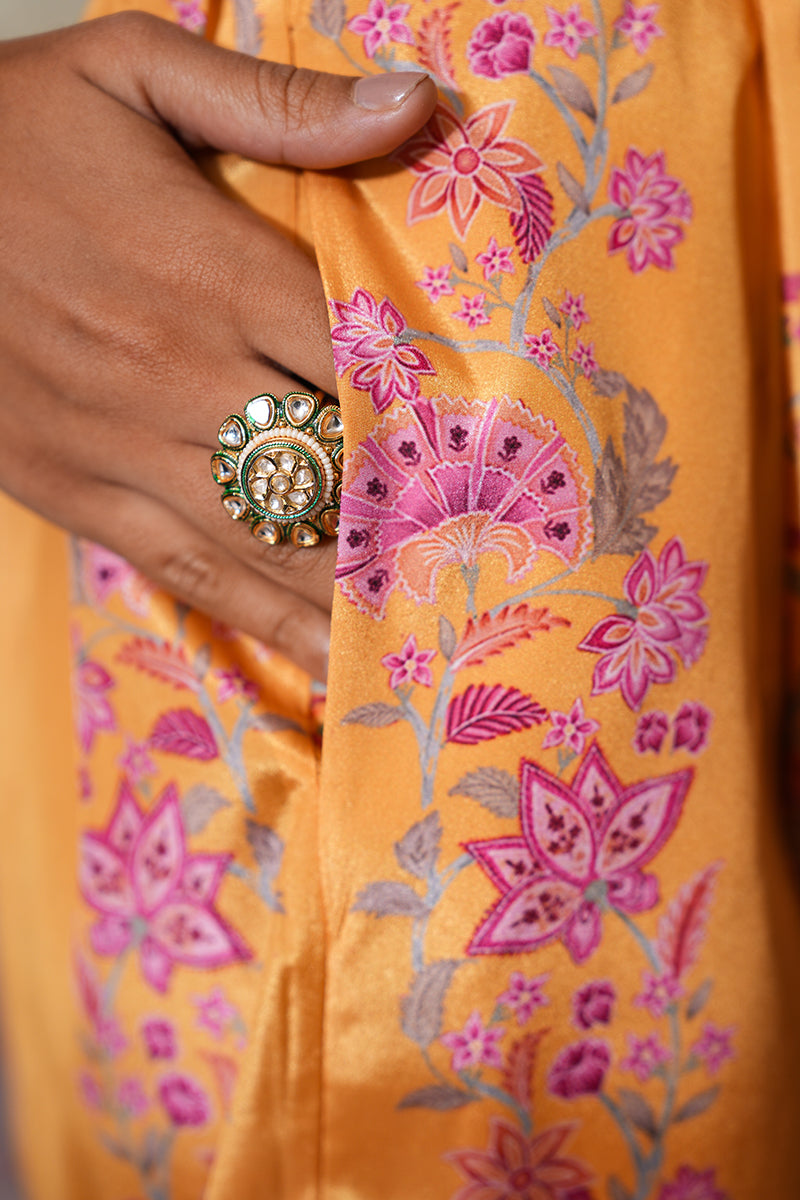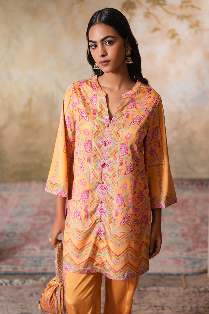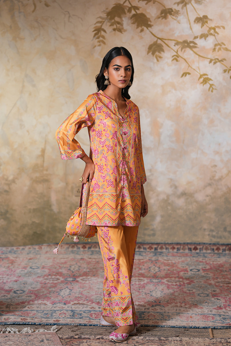 Gold Yellow Crepe Silk Printed Top With Gold Yellow Crepe Silk Printed Straight Pants