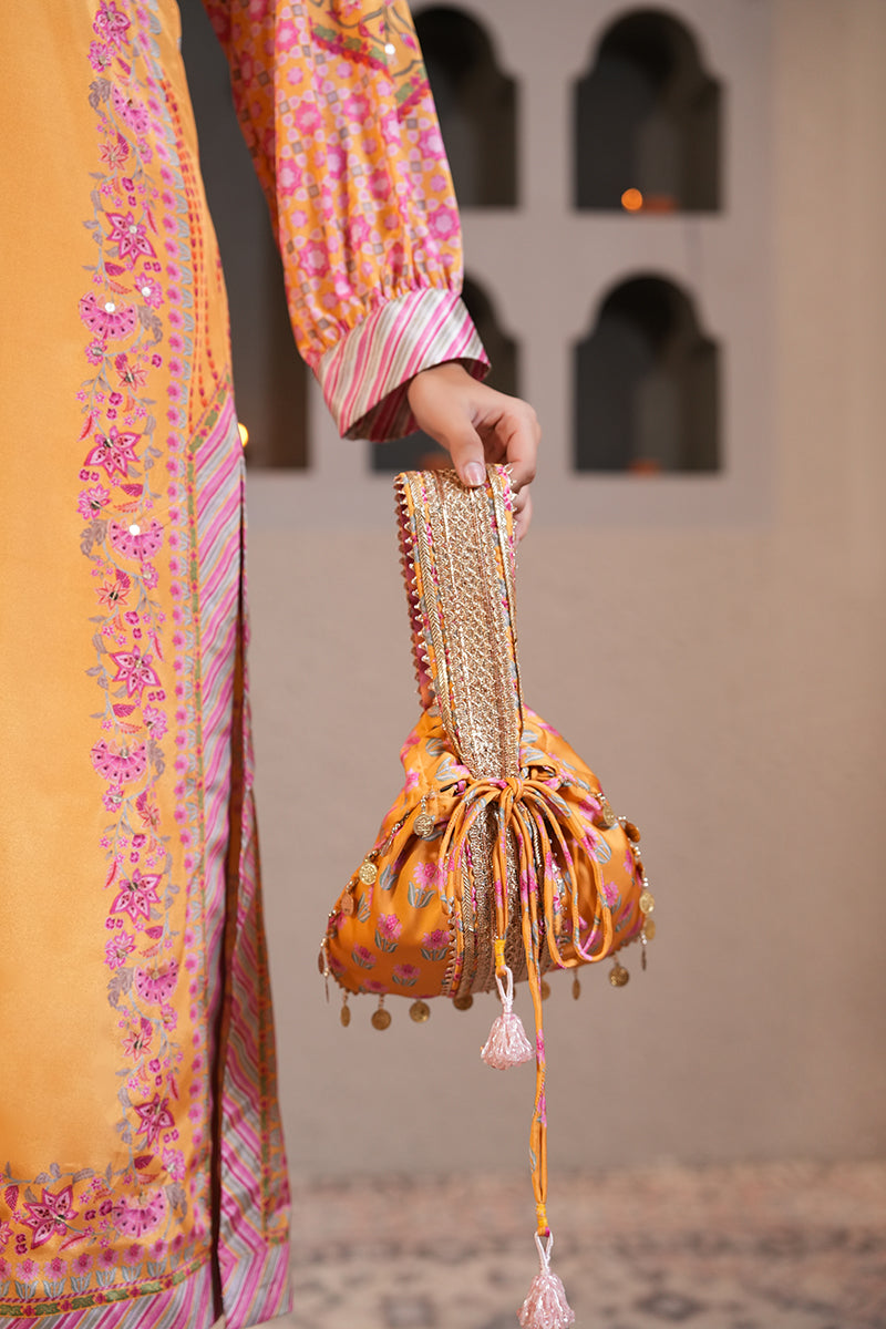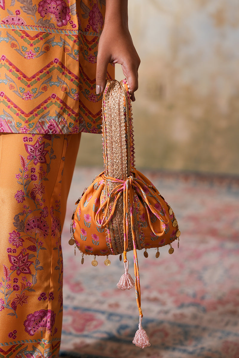 Gold Yellow Crepe Silk Printed Potli With Gota Work Detailing And Hand Embroidered Latkans