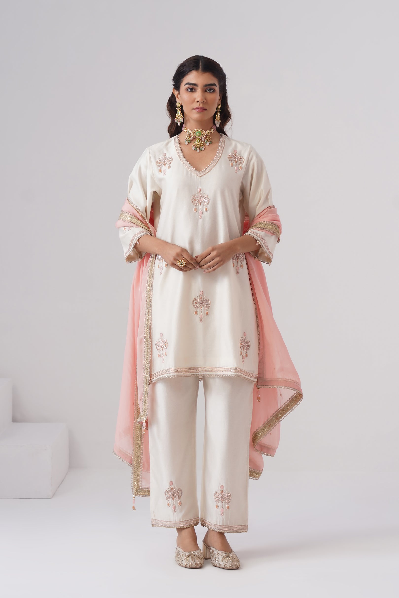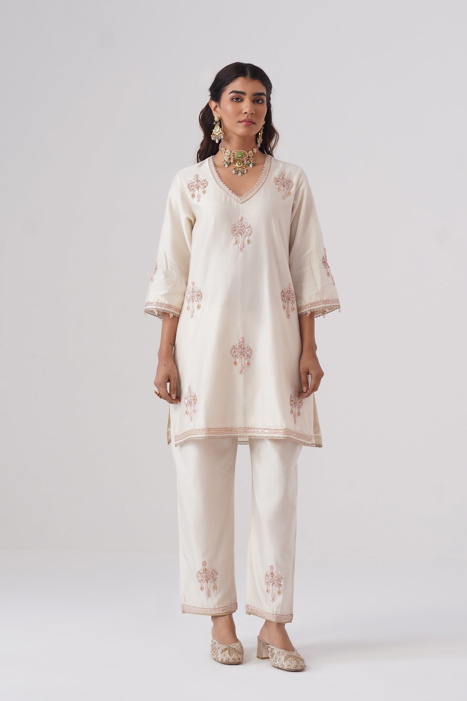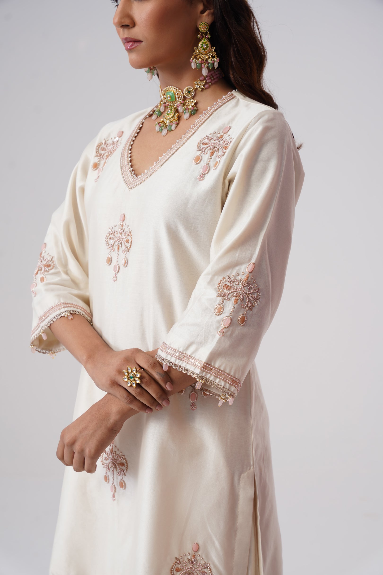 Rendered in a classic Ivory, the short kurta is crafted in Chanderi silk with a pure cotton lining for comfort. Designed with a V-neckline,full sleeves, and side slits, the straight silhouette offers a clean, modern look. The kurta is hand-embroidered with intricate zardozi work and semi-precious stones in rose gold and rose pink. Pearl embellishments highlight the neckline, while the sleeves are finished with rose pink stones and pearls for a refined touch.