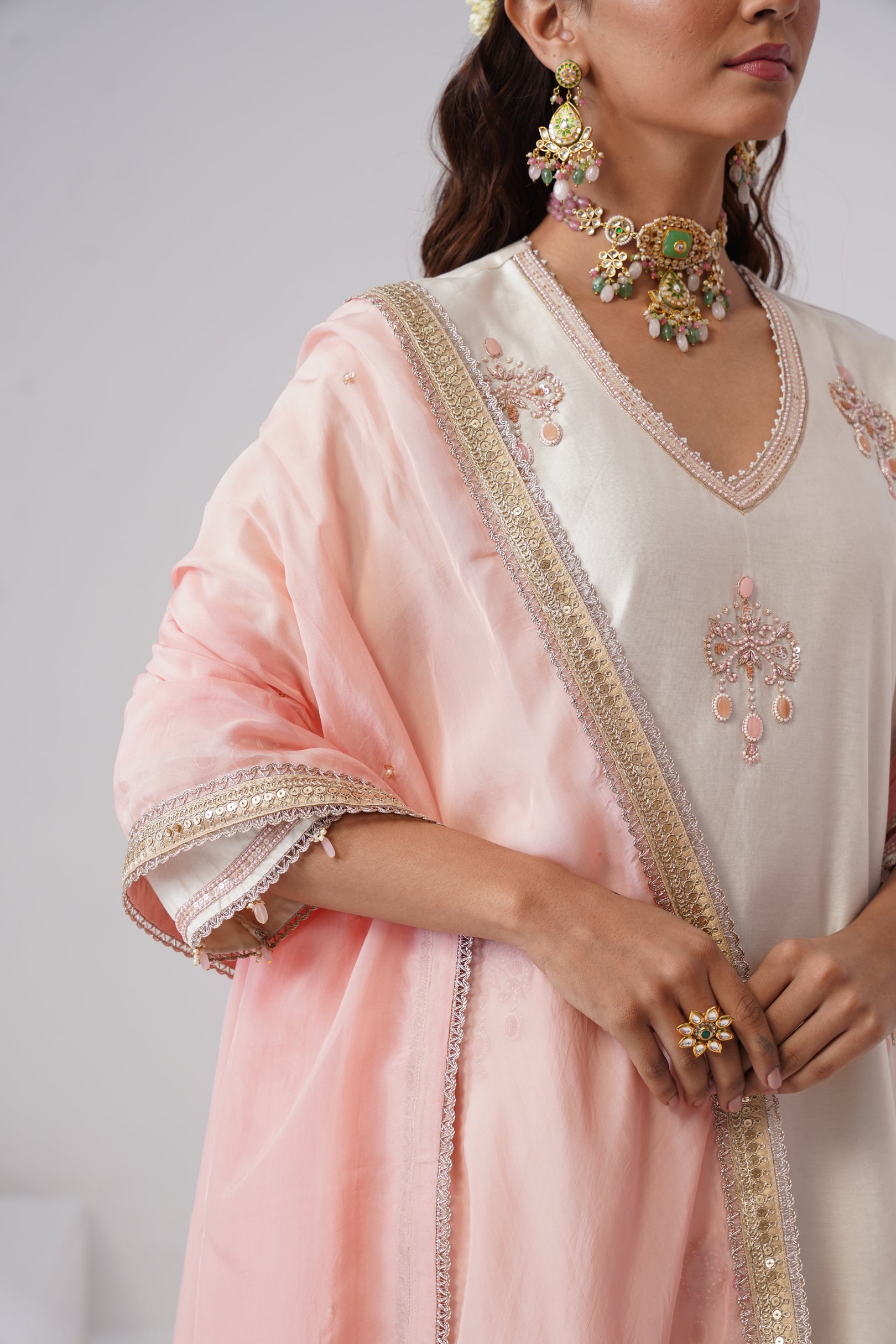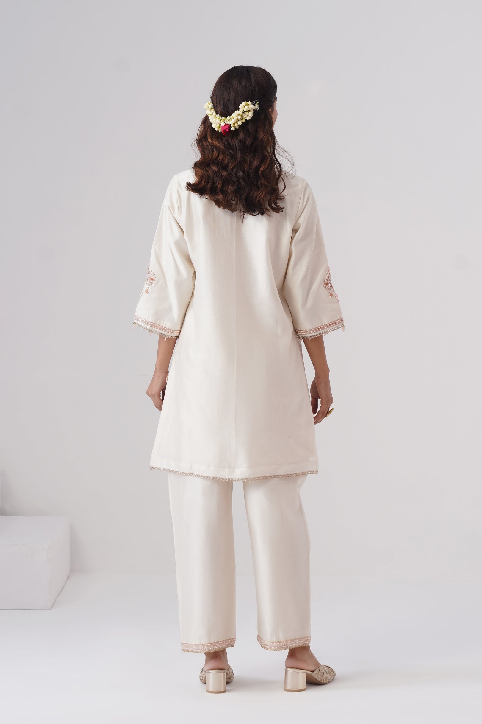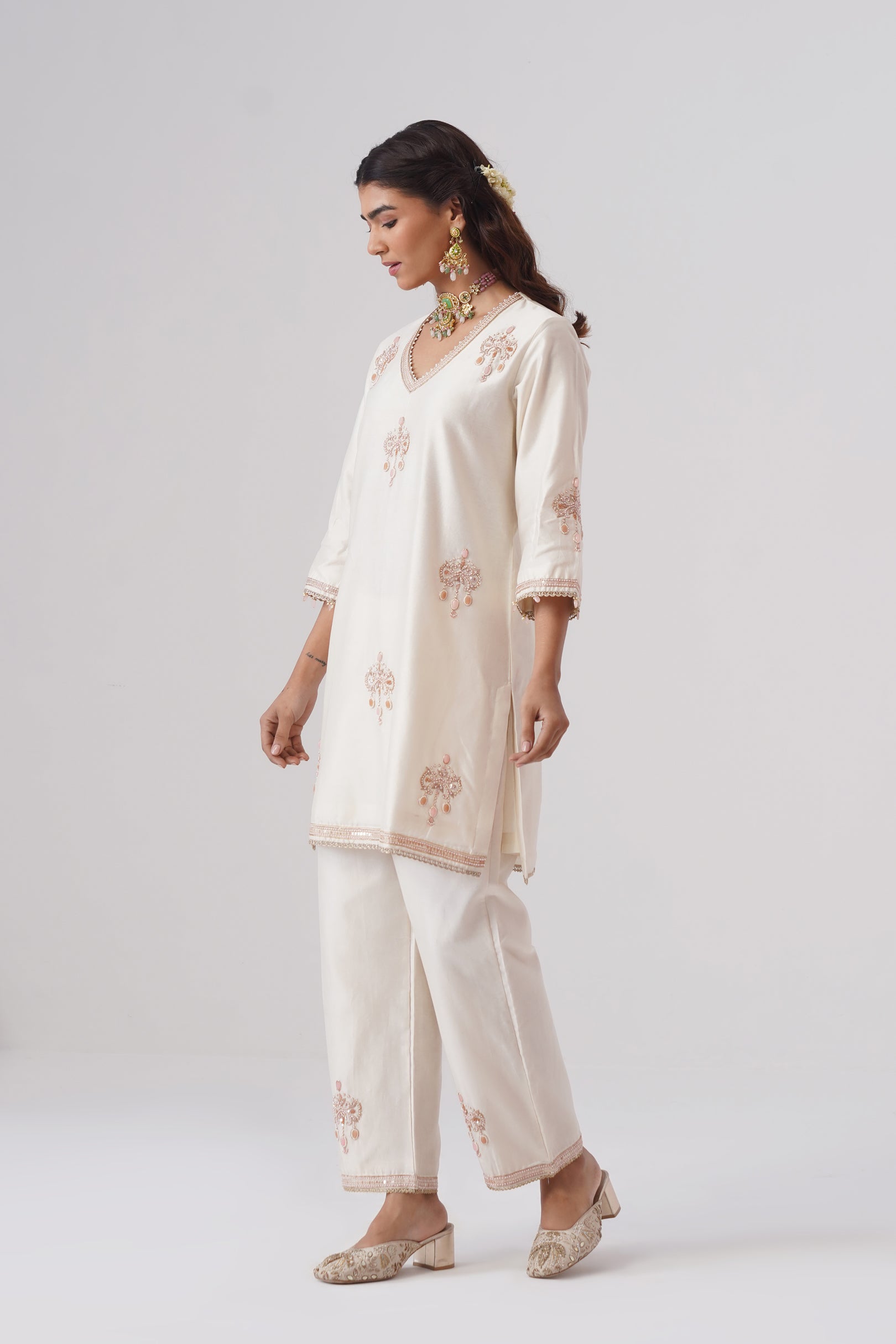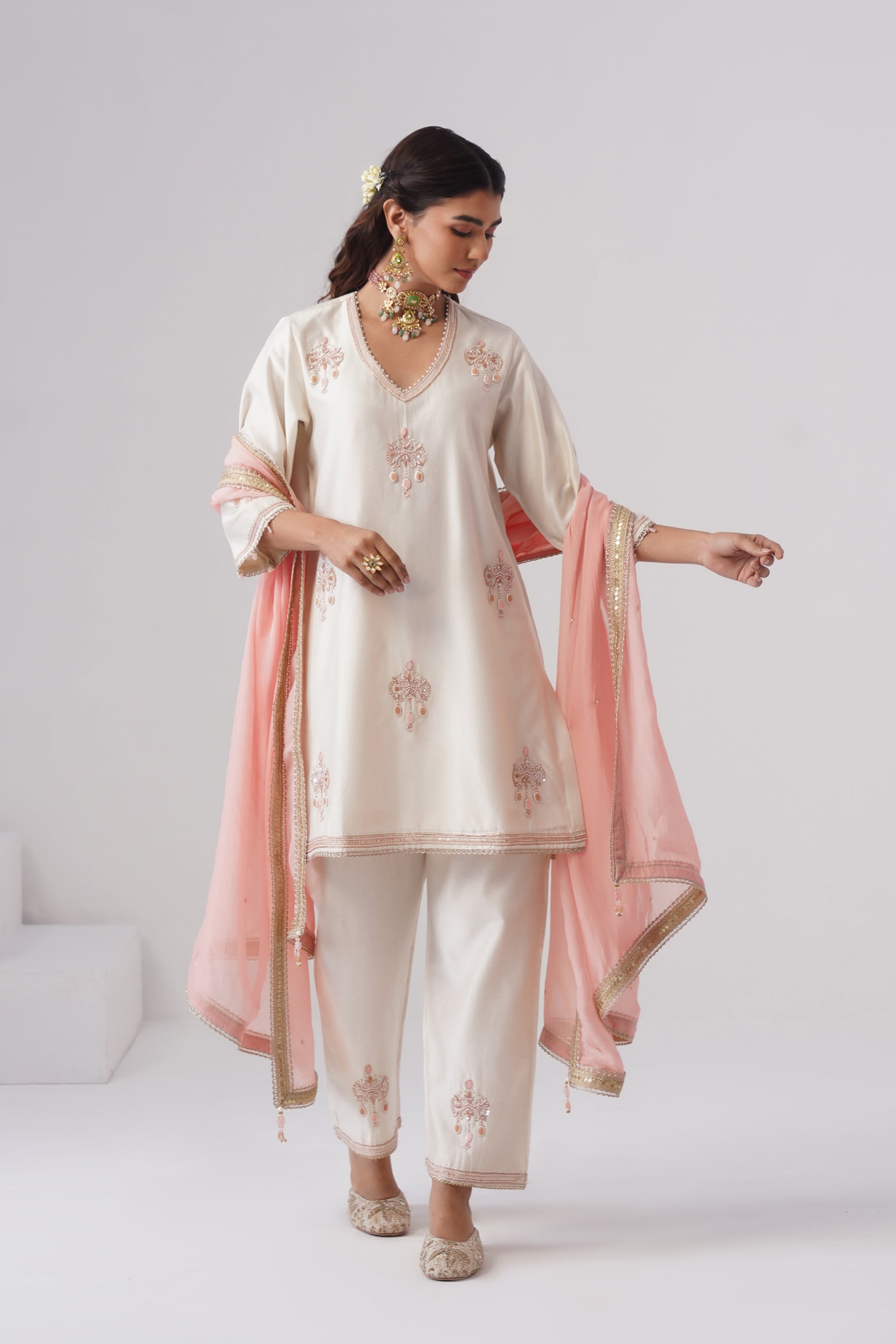 Rendered in a classic Ivory, the short kurta is crafted in Chanderi silk with a pure cotton lining for comfort. Designed with a V-neckline,full sleeves, and side slits, the straight silhouette offers a clean, modern look. The kurta is hand-embroidered with intricate zardozi work and semi-precious stones in rose gold and rose pink. Pearl embellishments highlight the neckline, while the sleeves are finished with rose pink stones and pearls for a refined touch.