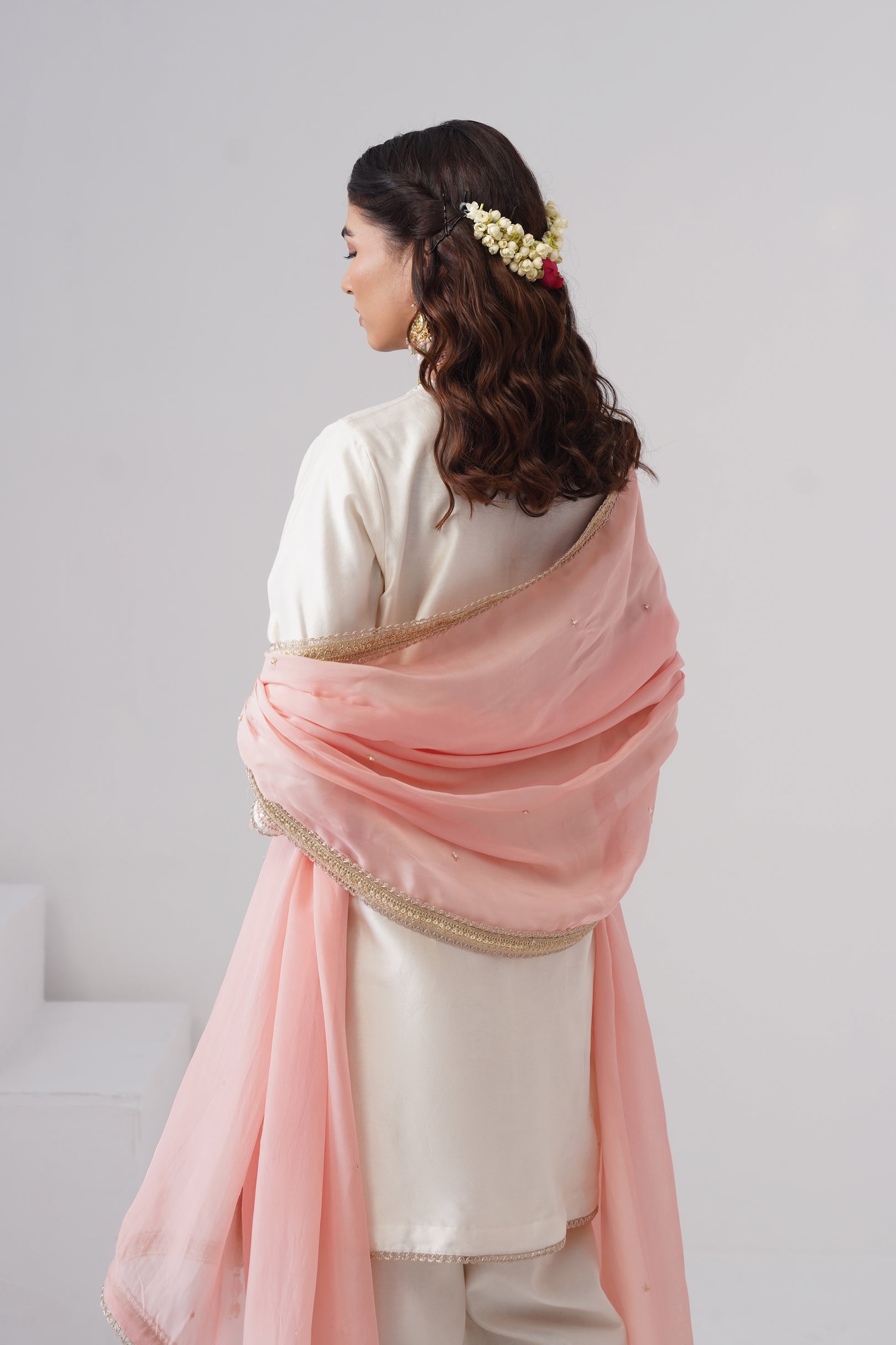 Paired with straight Chanderi silk pants, also lined with pure cotton, the set creates a cohesive tone-on-tone ensemble with delicate hand embroidery and stone detailing. A contrasting rose pink dupatta completes the look, accented with rose gold, lace finishing on all four sides, and coordinated latkans.