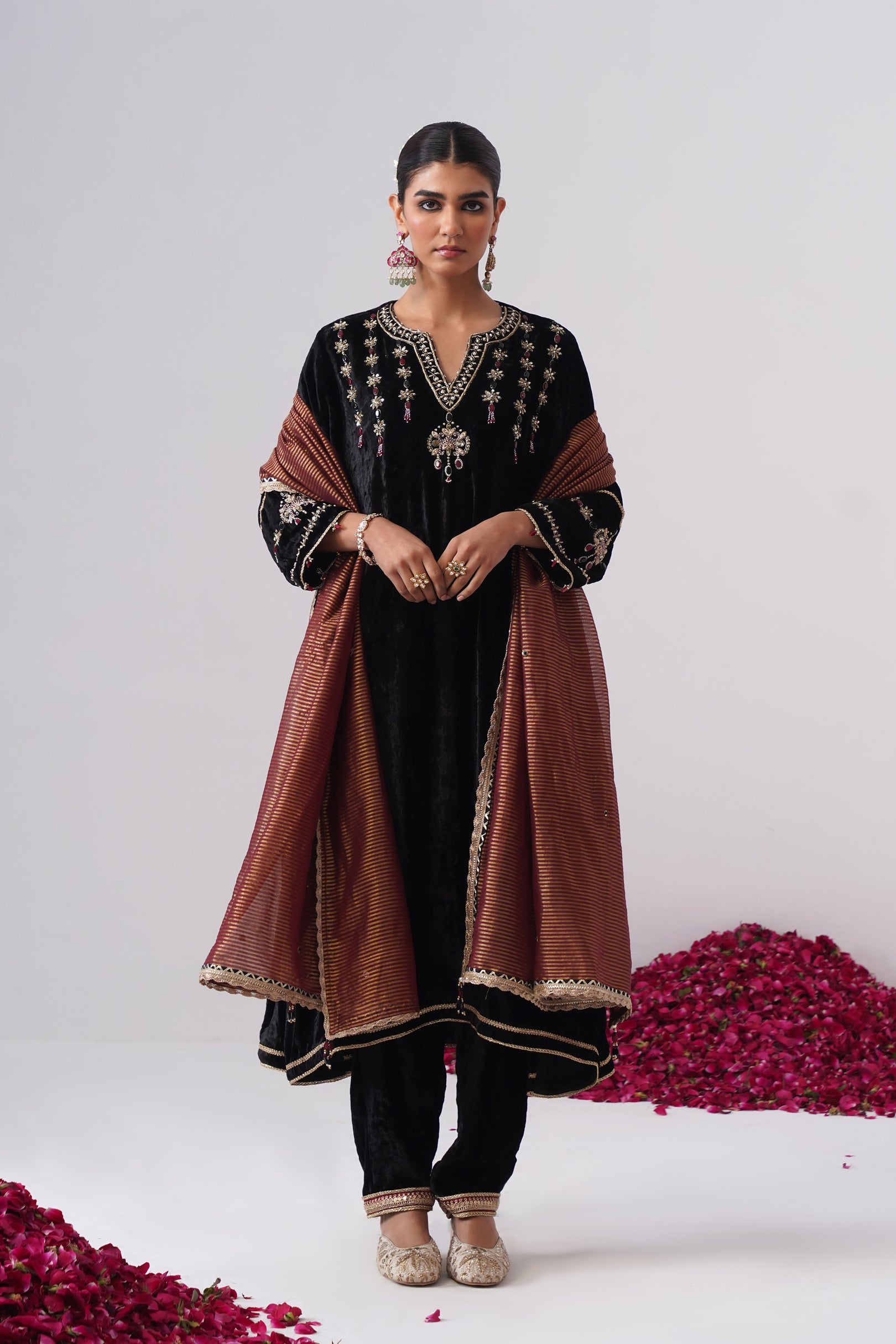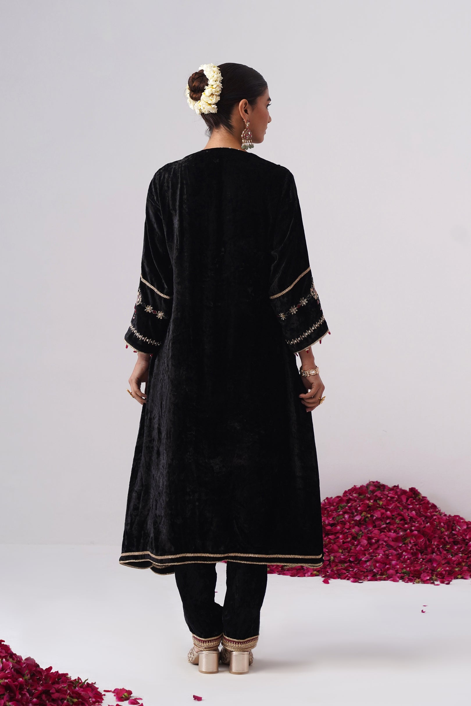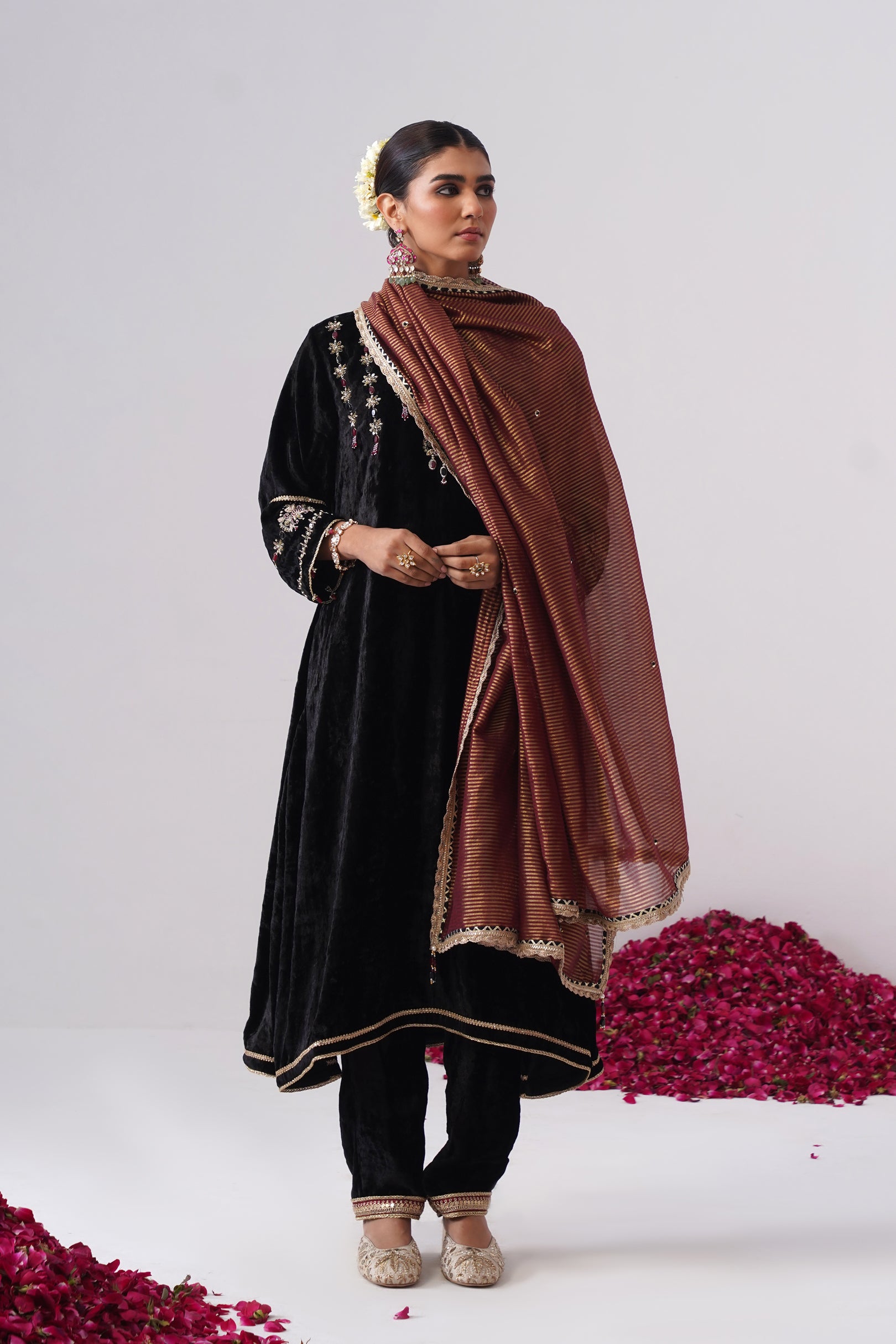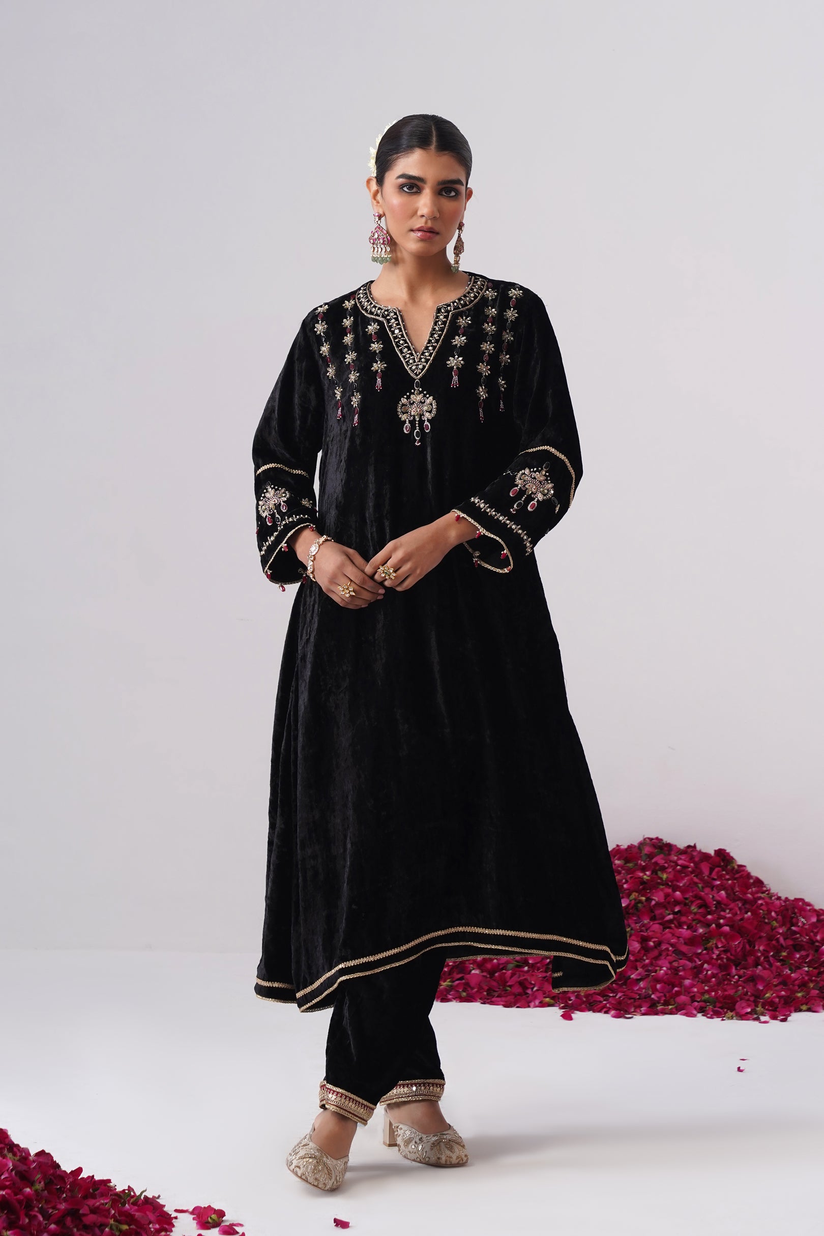 This black velvet Nazli kurta set is crafted in an elegant A-line silhouette with side slits for ease and fluid movement. Designed with full sleeves with maroon stone hangingsand functional pockets, the kurta is adorned with intricate zardozi embroidery on the yoke and sleeves, highlighted with black and maroon semi-precious jewel stones. It features a round neckline with a slit, highlighted with delicate handcrafted pearl detailing and is lined with pure cotton fabric. Gold lace detailing along the ghera adds a subtle festive glow, beautifully complementing the depth of the velvet.