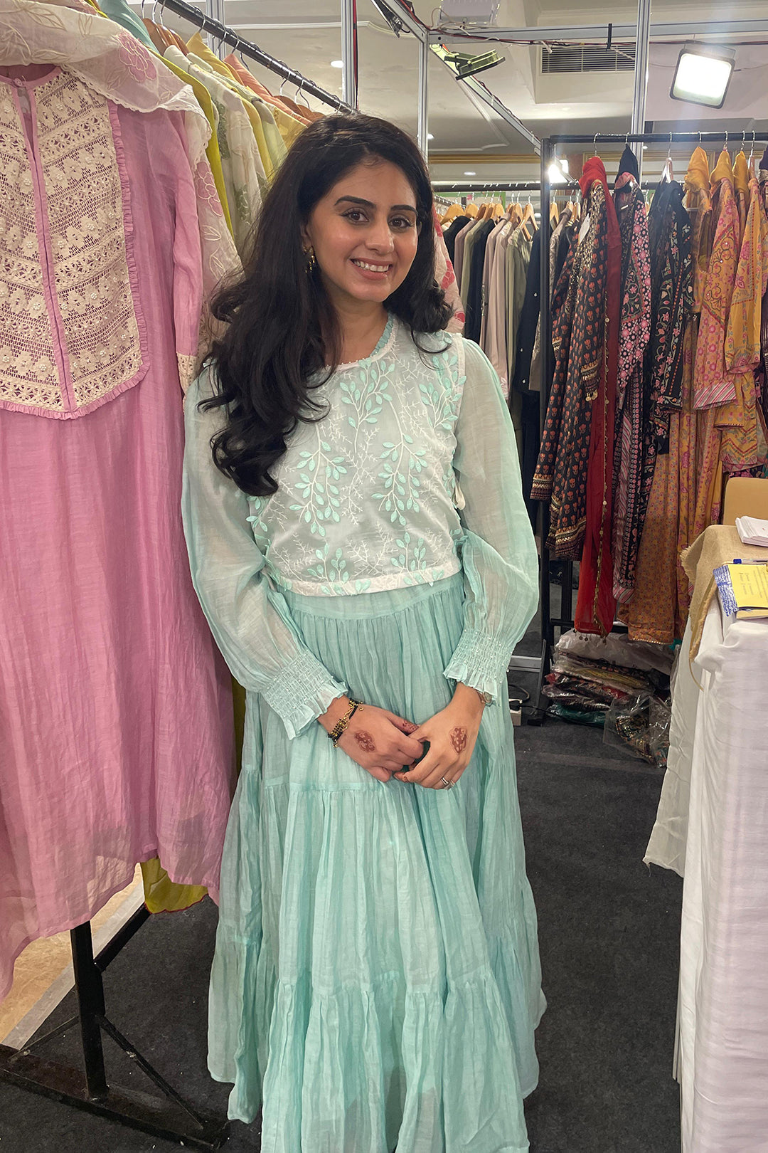Mul chanderi tier dress paired with applique work gilet and pearl embroidery