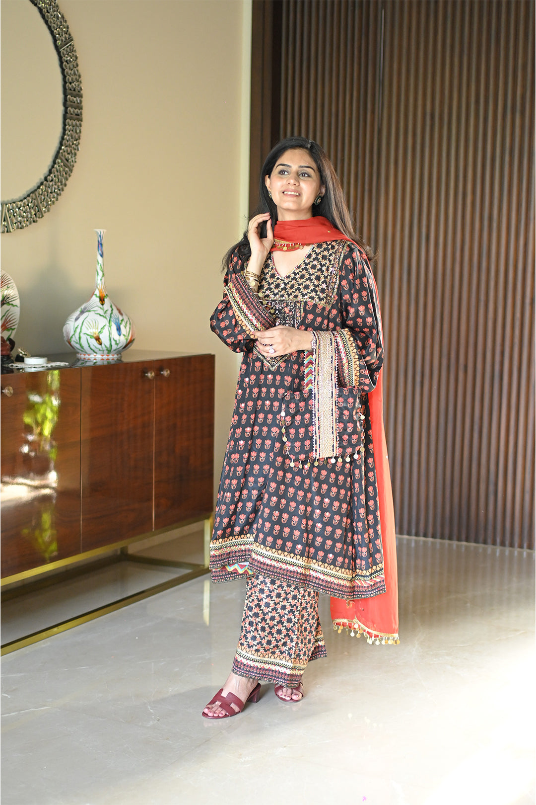 Black Crepe Silk Hand Embroidered Printed Kurta With Black Crepe Silk Printed Palazzo Pants With Gota Work