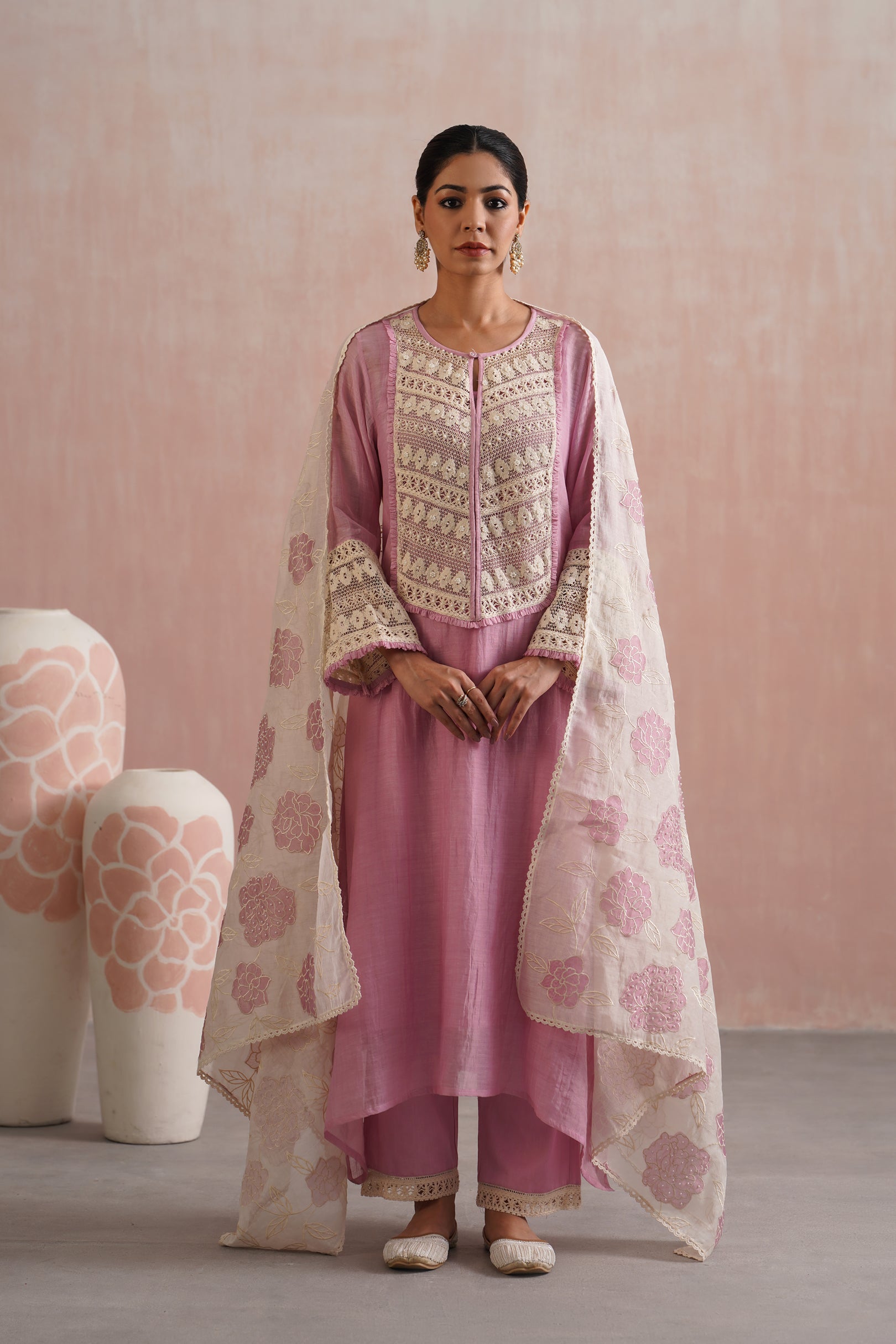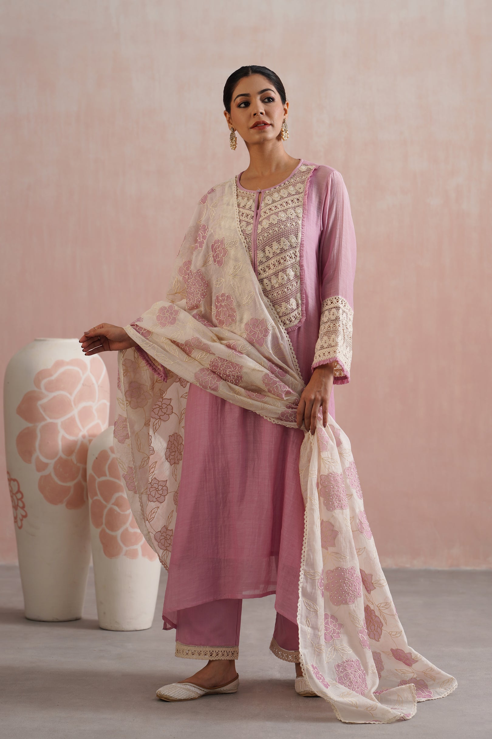 Mul chanderi pearl embroidered lace detailing in kurta paired with cotton pants and mul chanderi applique work dupatta