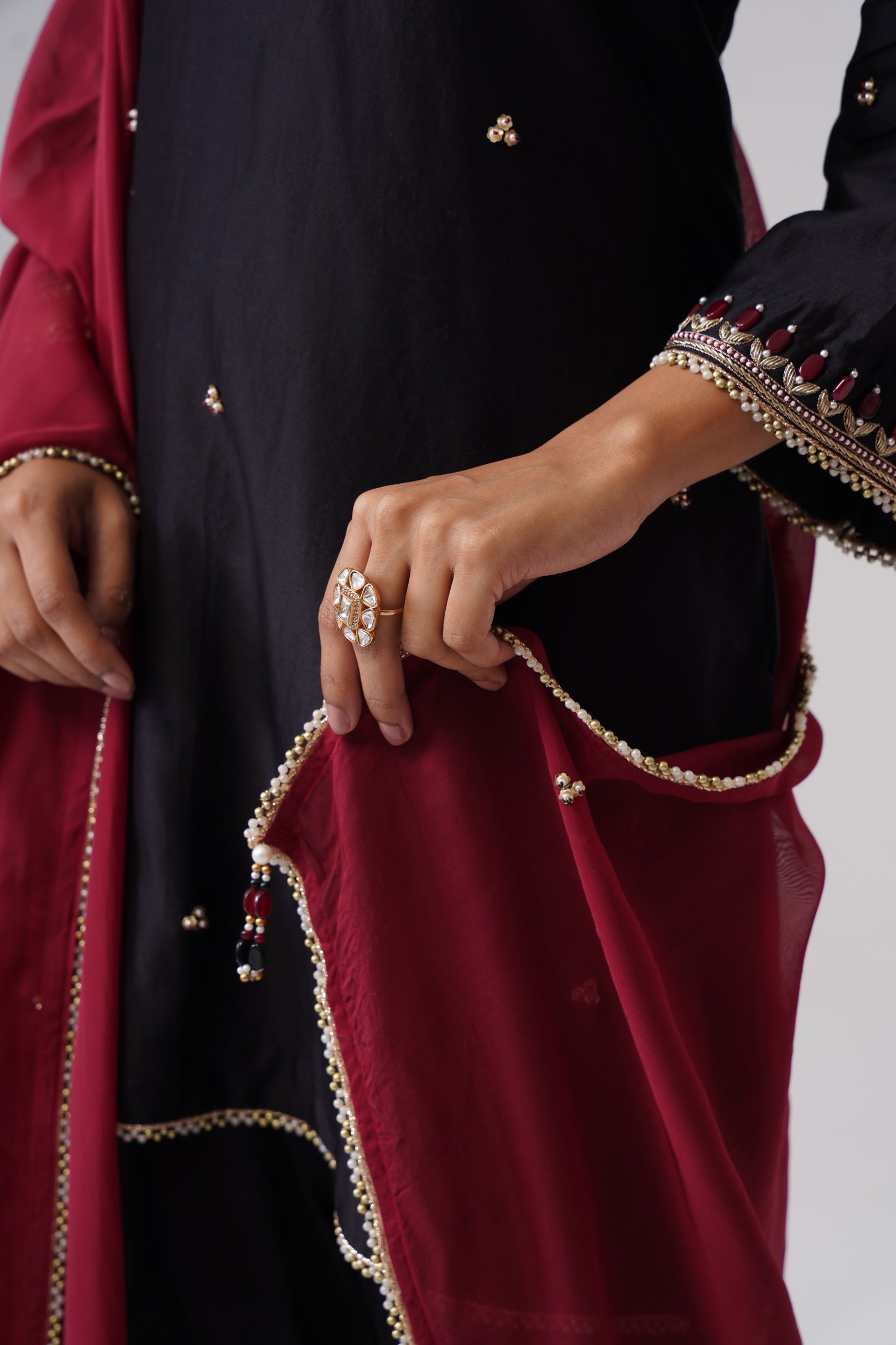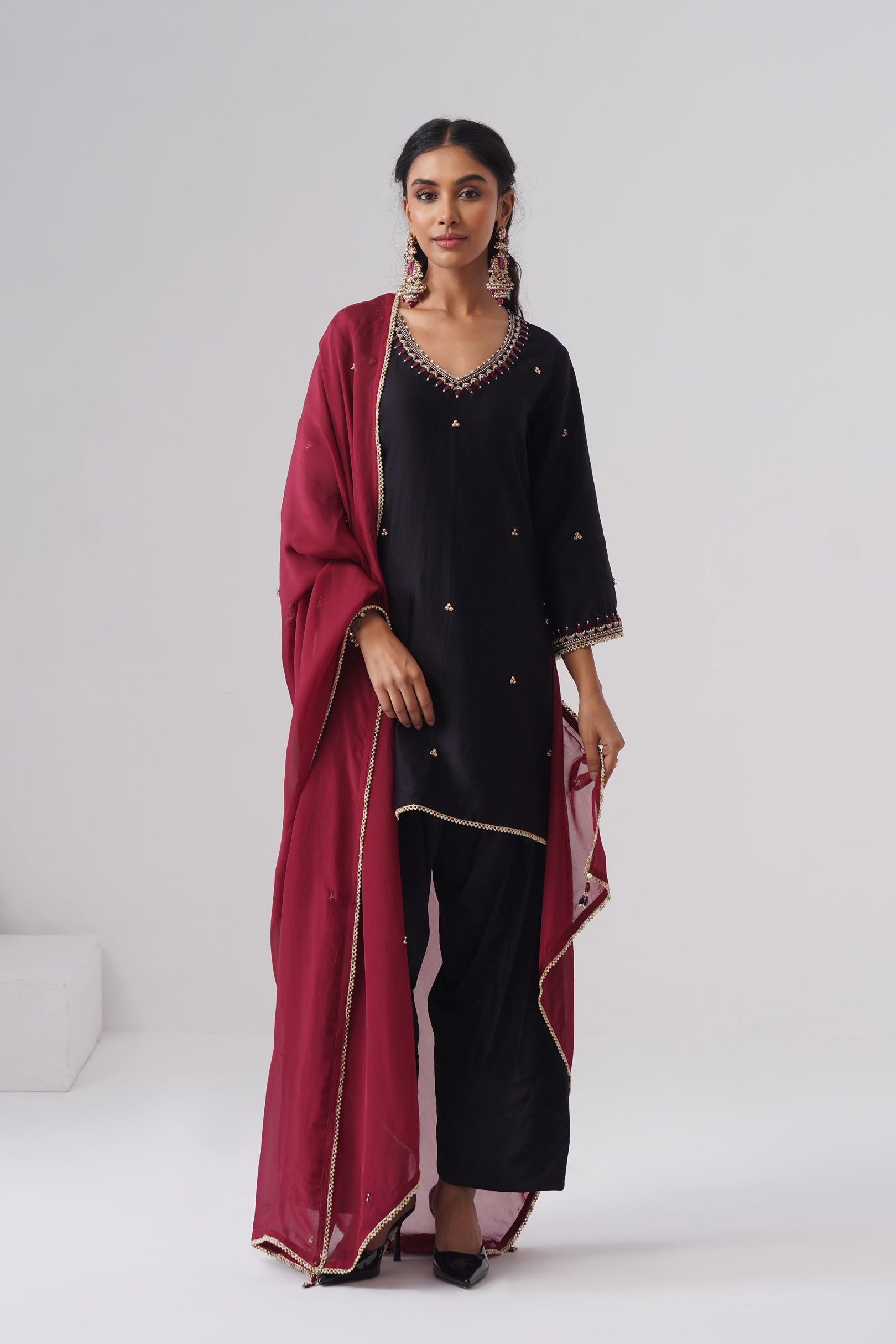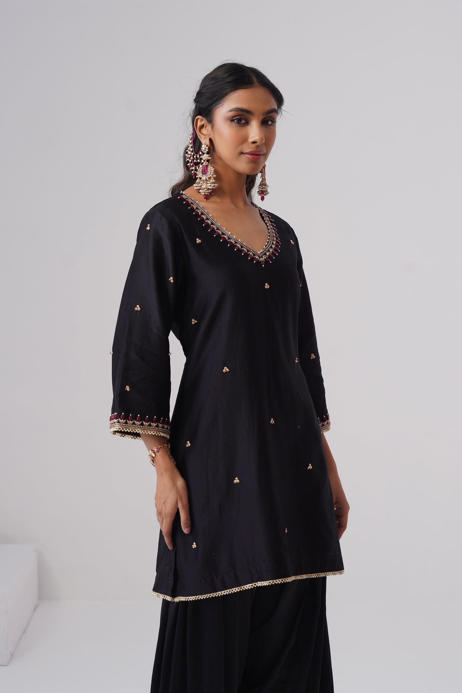 Rendered in a classic black, the short kurta is crafted in pure Chanderi silk, lending it a light, graceful sheen. Designed with a flattering V-neckline and three-quarter sleeves, the kurta features side slits for ease and movement. Intricate hand embroidery adorns the surface, highlighted with semi-precious maroon stones that echo the hue of the contrasting dupatta, along with fine zardozi work. Delicate pearl detailing finishes the neckline and sleeves, adding a soft, elegant touch. The kurta is lined with pure cotton for all-day comfort.