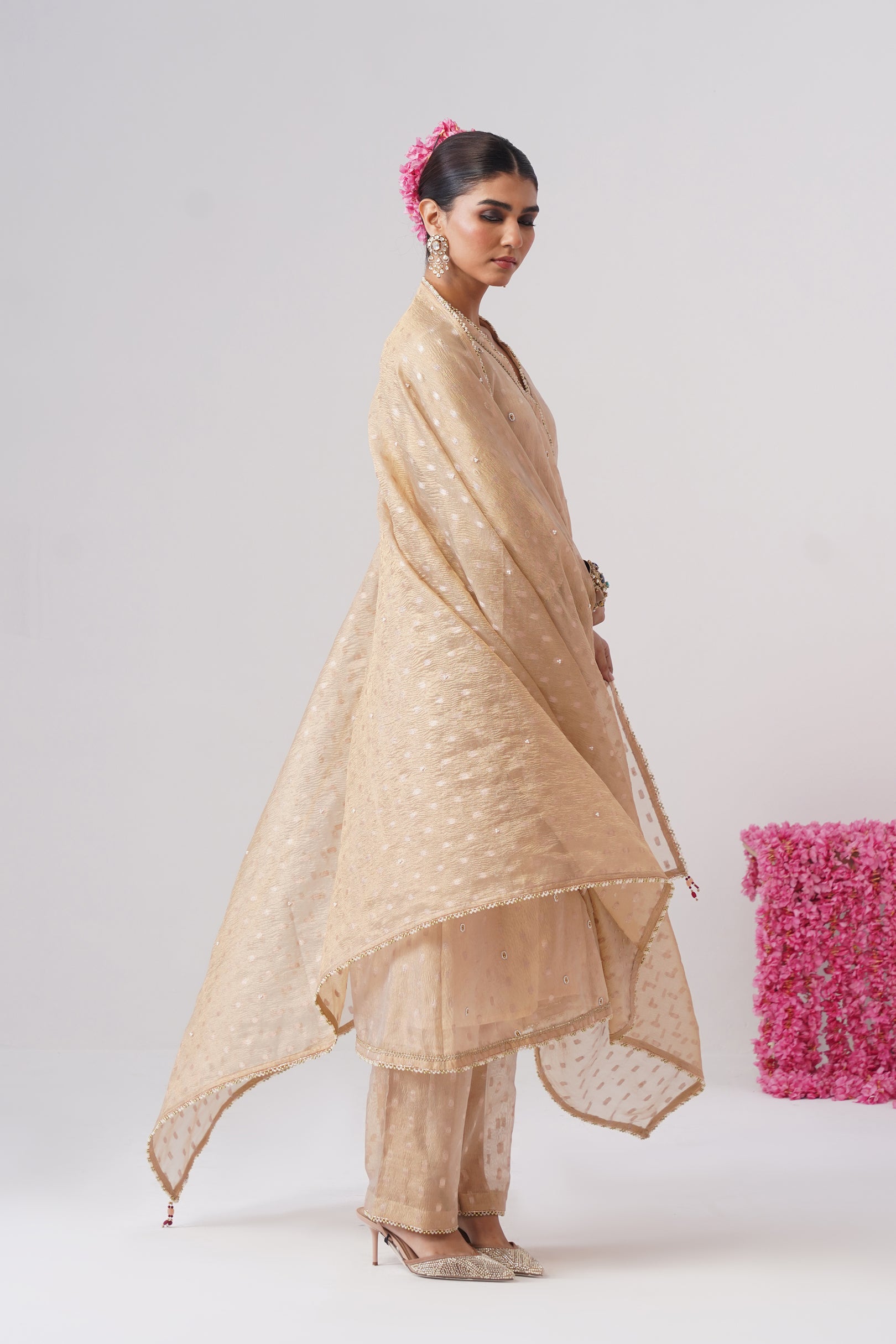 The cotton silk pants are detailed with a crushed tissue silk patch and finished with pearl lace, perfectly complementing the kurta’s ornate finish. Completing the ensemble is a matching gold crushed tissue silk dupatta, adorned with woven zari polkas, pearl embroidery, pearl lace borders, and latkans on all four sides for an elevated, cohesive look.