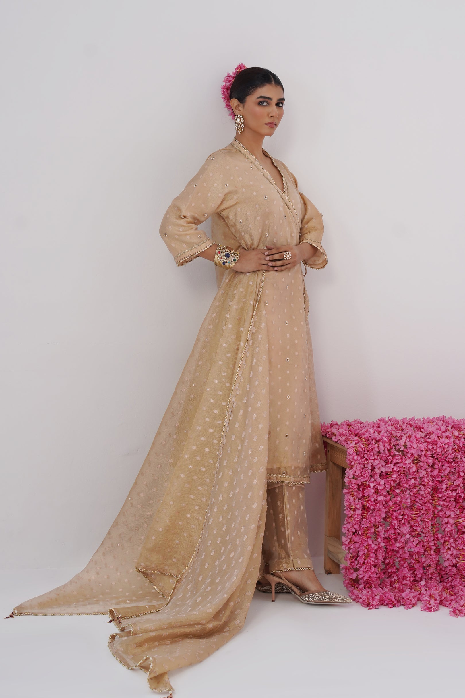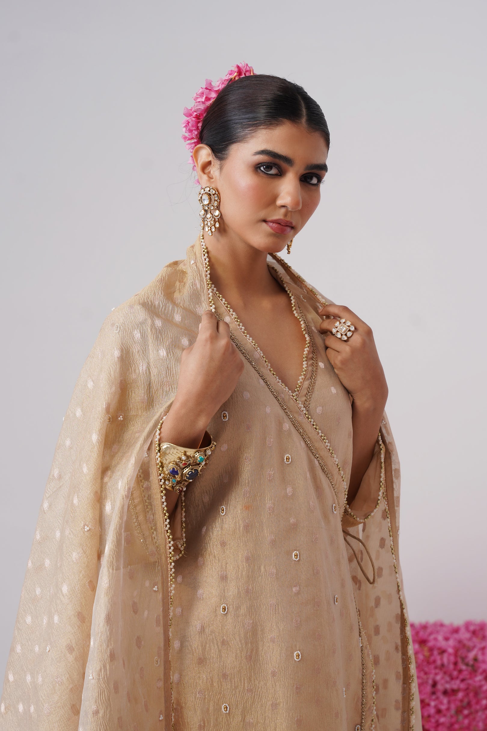 Gold pearl embroidered crushed tissue silk angrakha paired with cotton silk pants and embroidered crushed tissue silk dupatta
