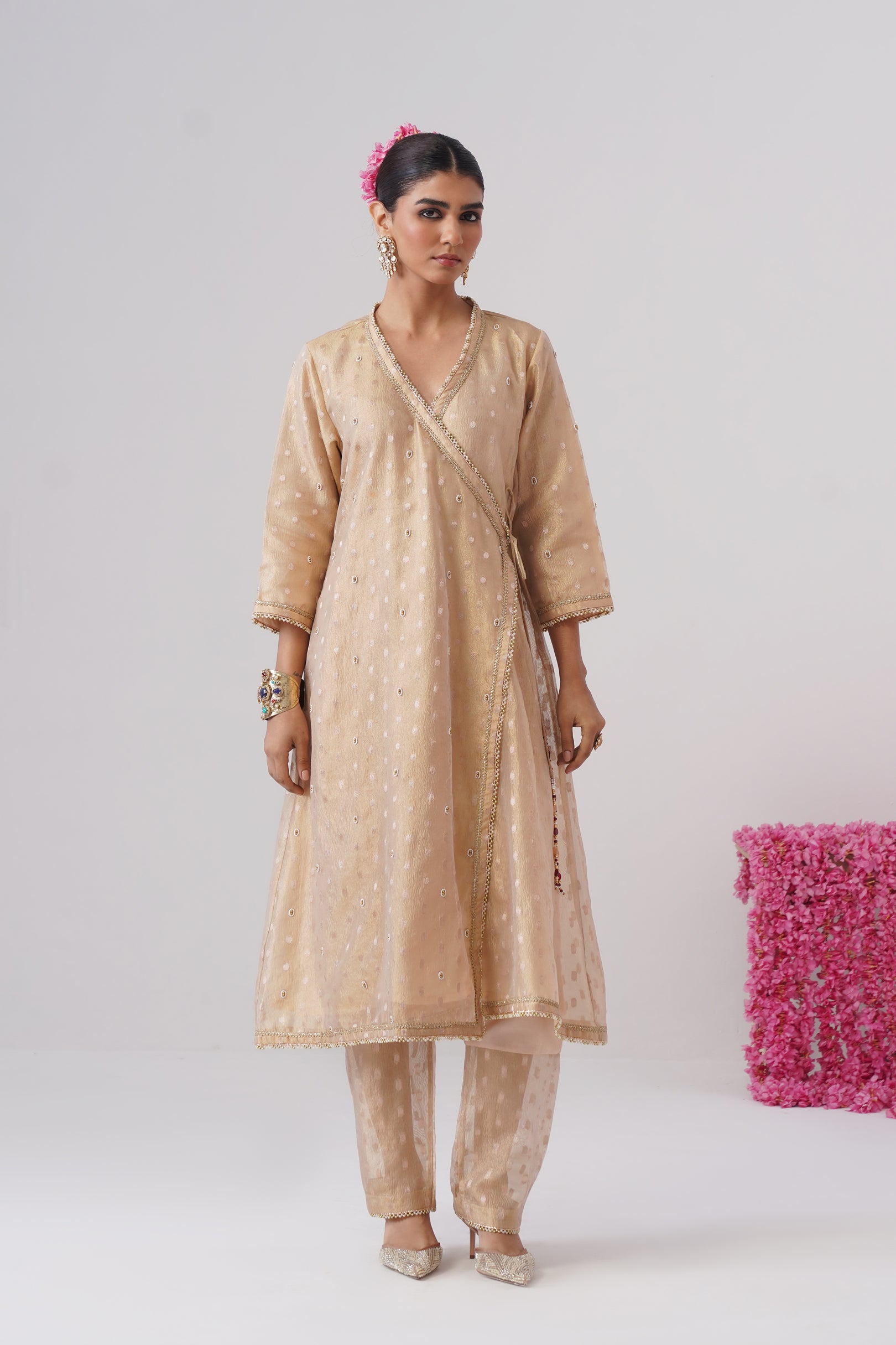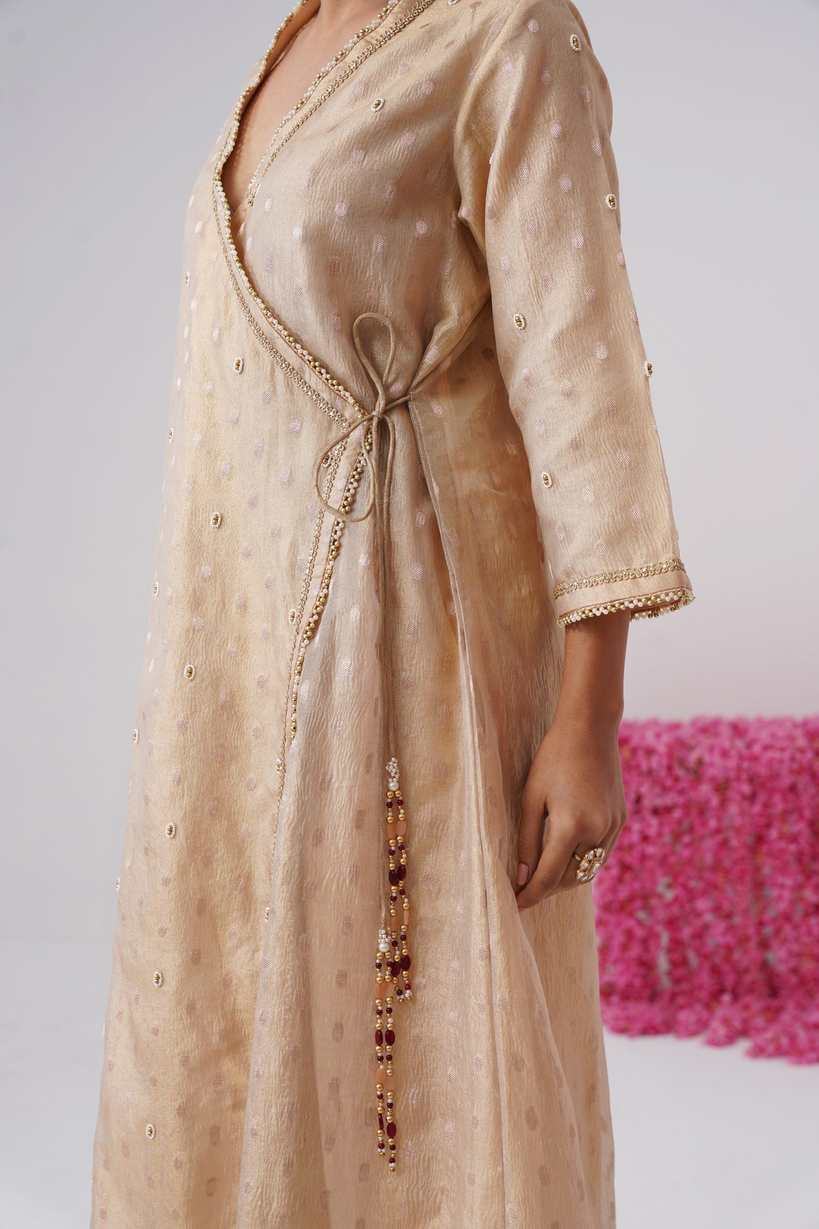 This all-gold Angrakha kurta is crafted in crushed tissue silk with delicate woven zari polkas, creating a rich, luminous festive appeal. Designed in a classic wrap silhouette, it features a button closure on one side and a traditional dori tie-up on the other, finished with semi-precious stone tassels. The kurta is beautifully embellished with pearl embroidery, golden beadwork, and lace detailing throughout, and is lined with pure cotton for comfortable wear.